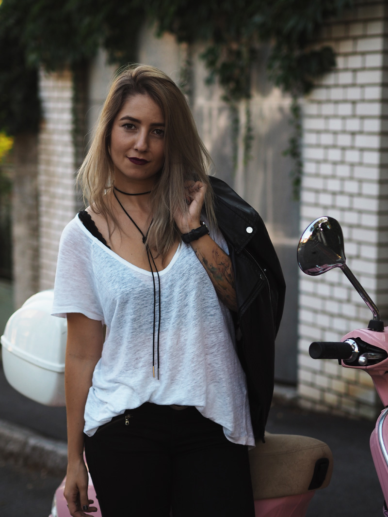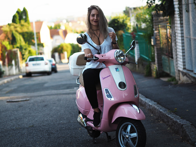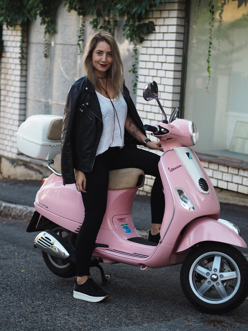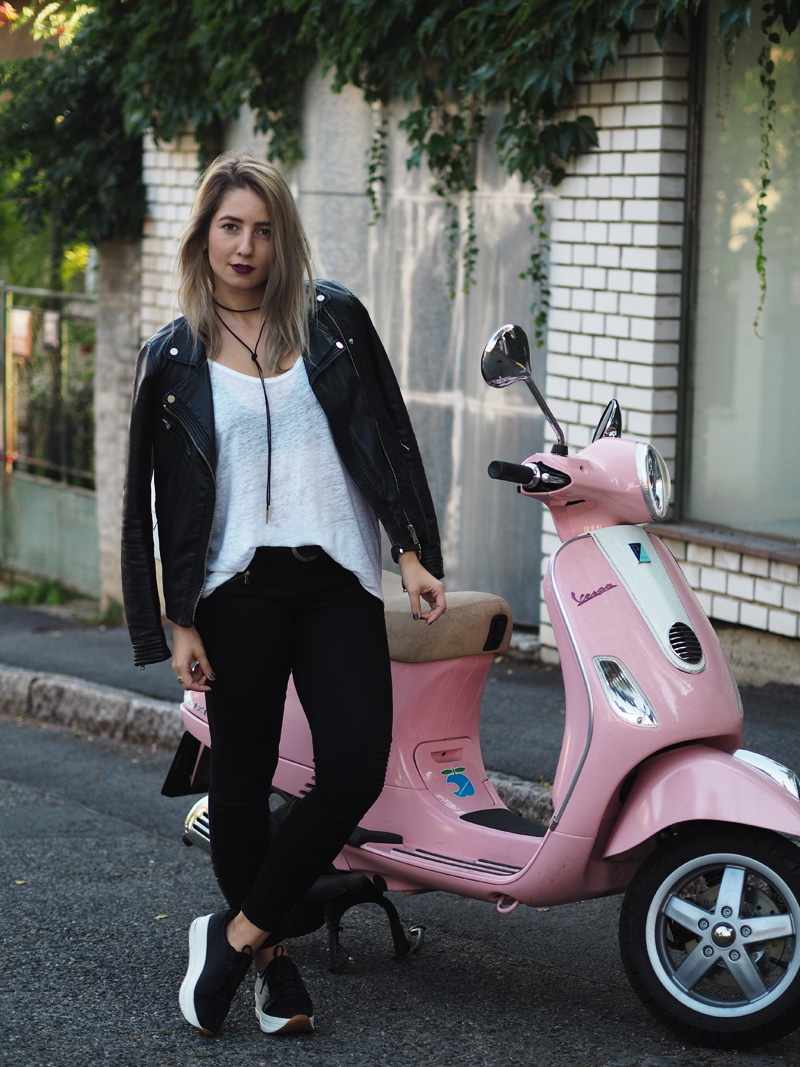 Sice mám v zásobě ještě několik outfitů z teplejších dnů a s blonďatou hlavou, nicméně z těhlech fotek jsem tak nadšená, že Vám je chci ukázat jako první. A taky proto, že musím dát za pravdu všem, co říkají, že šedá na vlasech vůbec nedrží, protože po jednom mytí je jí opravdu velkej kus dole a to je pěkná škoda. Tady si ji ale můžete prohlédnout ještě v té nejčerstvější podobě a myslím, že to dokonale ladí právě s růžovou Vespou, kterou jsme si s Kubou půjčili na vyjížďku od jeho ségry. Připadala jsem si na ní jak někde na prázdninách nebo ve filmu a hrozně jsem si těch pár minut užila. Logicky mě teda napadlo u ní i vyfotit outfit. Ty kalhoty a bundu jsem neměla na sobě snad několik měsíců, protože jsem se jednou nechala u Kuby doma ve skříni a pak jsem je zuřivě hledala všude možně a nechápala, že jsem schopná ztratit nejlepší černý kalhoty, co jsem kdy měla. To jsou ty problémky, když přebýváte na několika místech zároveň. Vagabondy nosím prakticky neustále a rozhodně mě nepřestávají bavit a to samé platí i pro choker. Specielně tento vázací, který jsem našla na Aliexpressu, stál asi dolar a přišel mega rychle (kdyžtak odkaz TU).