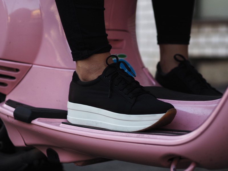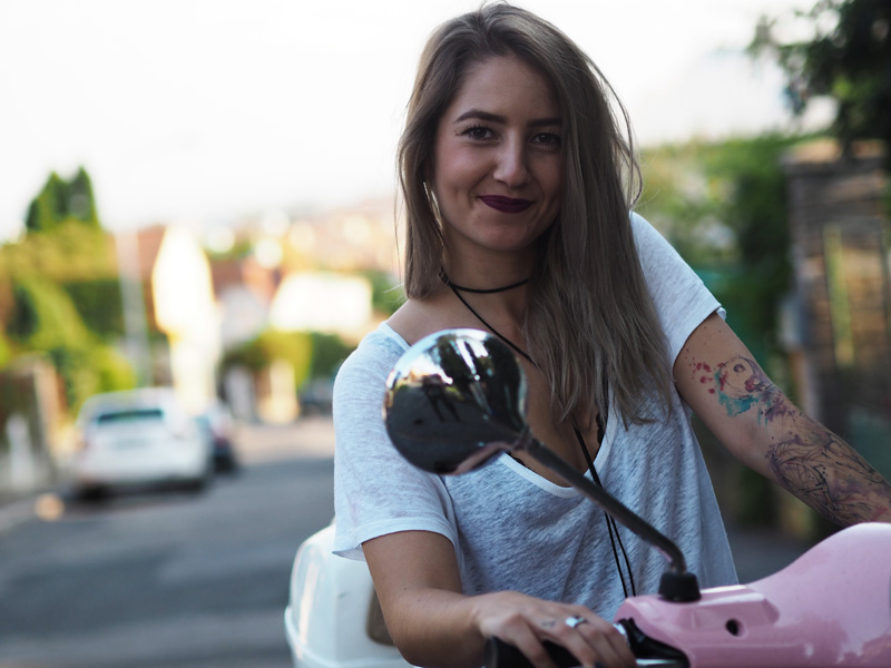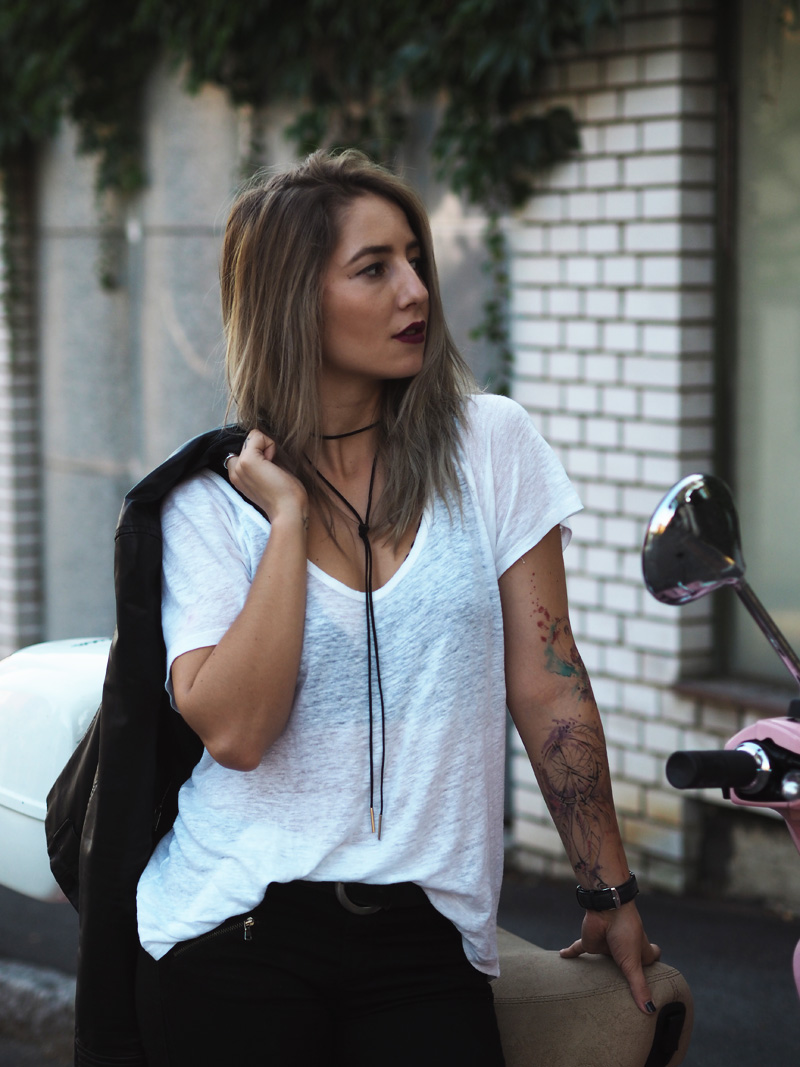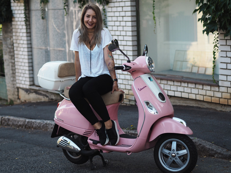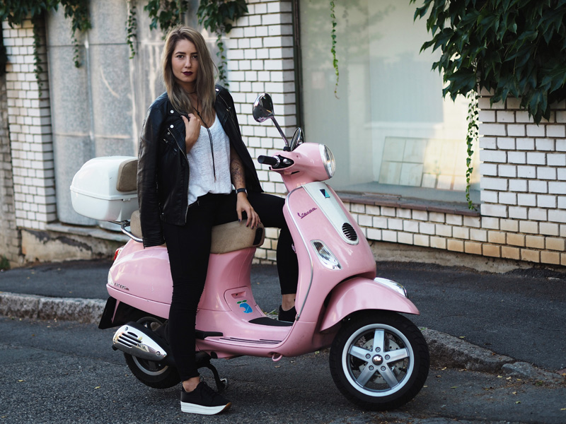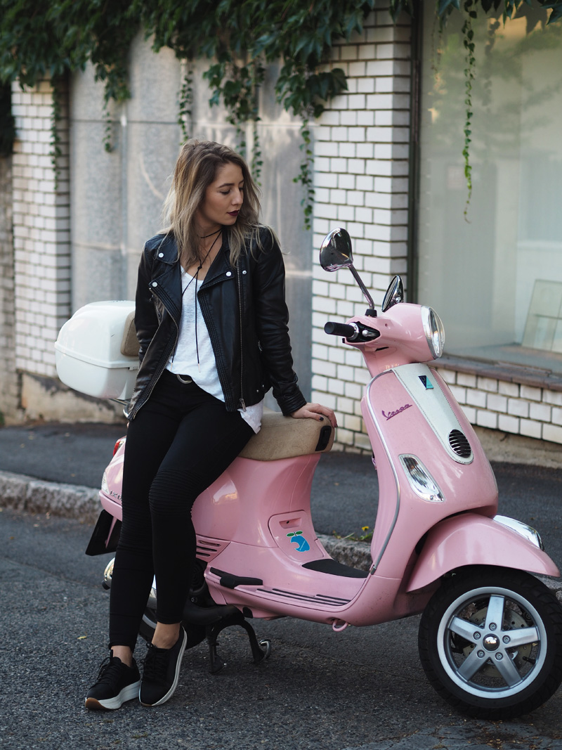 Sice mám v zásobě ještě několik outfitů z teplejších dnů a s blonďatou hlavou, nicméně z těhlech fotek jsem tak nadšená, že Vám je chci ukázat jako první. A taky proto, že musím dát za pravdu všem, co říkají, že šedá na vlasech vůbec nedrží, protože po jednom mytí je jí opravdu velkej kus dole a to je pěkná škoda. Tady si ji ale můžete prohlédnout ještě v té nejčerstvější podobě a myslím, že to dokonale ladí právě s růžovou Vespou, kterou jsme si s Kubou půjčili na vyjížďku od jeho ségry. Připadala jsem si na ní jak někde na prázdninách nebo ve filmu a hrozně jsem si těch pár minut užila. Logicky mě teda napadlo u ní i vyfotit outfit. Ty kalhoty a bundu jsem neměla na sobě snad několik měsíců, protože jsem se jednou nechala u Kuby doma ve skříni a pak jsem je zuřivě hledala všude možně a nechápala, že jsem schopná ztratit nejlepší černý kalhoty, co jsem kdy měla. To jsou ty problémky, když přebýváte na několika místech zároveň. Vagabondy nosím prakticky neustále a rozhodně mě nepřestávají bavit a to samé platí i pro choker. Specielně tento vázací, který jsem našla na Aliexpressu, stál asi dolar a přišel mega rychle (kdyžtak odkaz TU).