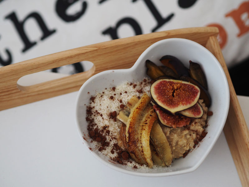 Jsem zvyklá na slaný vajíčkový snídaně a dělaj mi nejlíp, proto si je před tréninkem dávám skoro vždycky, nicméně když mám rest day a chci, aby tělo co nejvíc zregenerovalo, pošlu tam ráno moc ráda misku ovesný kaše se vším, co doma najdu. A hlavně s opečeným banánem, protože jinak už by to pro mě nebylo ono.