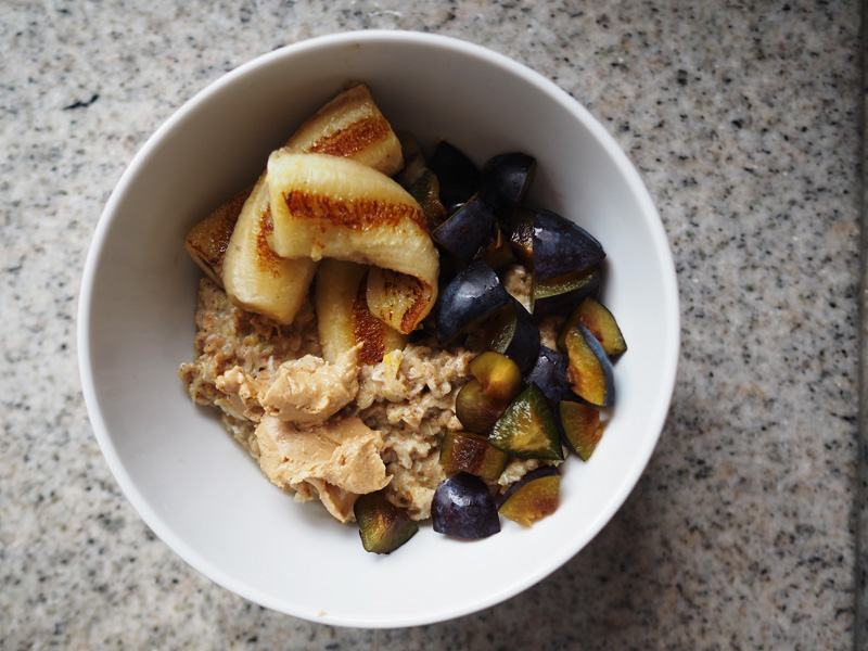 Oblíbenec – zoats s opečeným banánem, švestkama a kešu máslem. Recept jsem Vám točila i do vlogu, kterej bude venku tak pozítří.