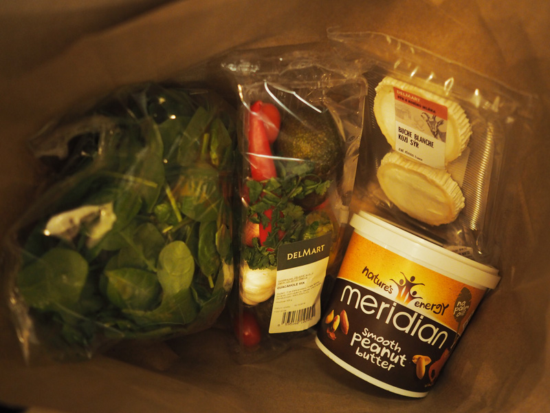 Taška plná štěstí z Delmartu. Kilový burákový máslo ve slevě, nejlepší kozí sýr, špenát a mix na guacamole (avokádo, limeta, česnek, rajčata, chilli paprička).