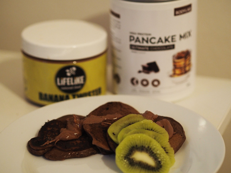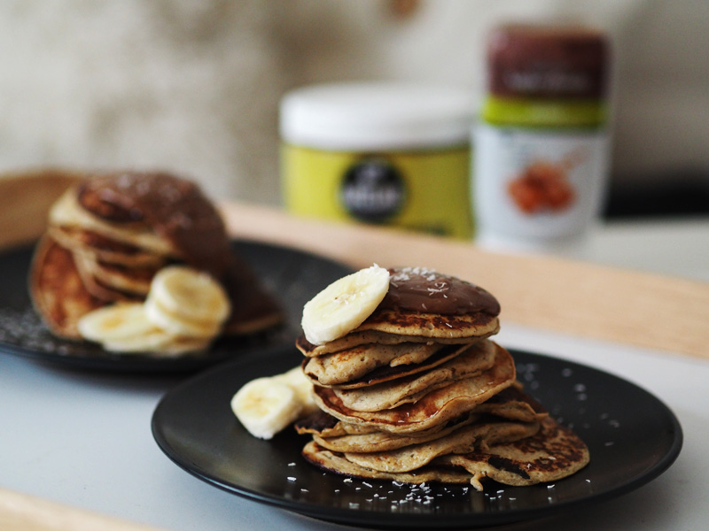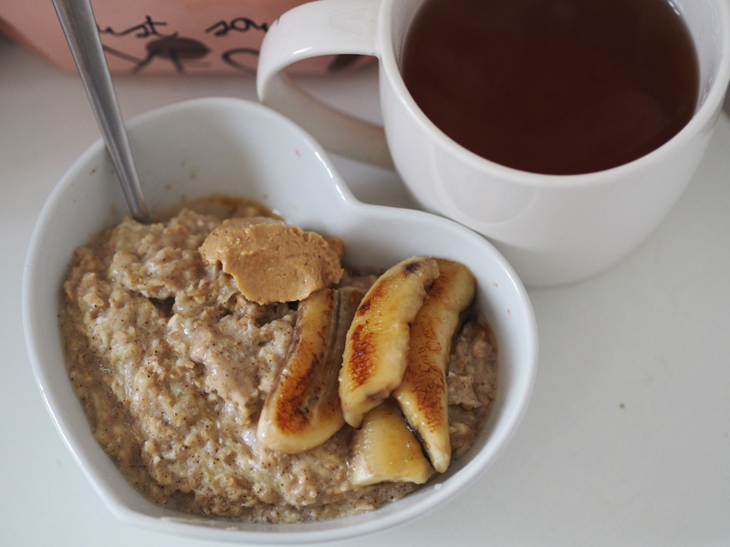 50g ovesných vloček, 120g cukety, 1 vejce, 100ml mandlové Alpro, 65g banán, 25g kešu máslo