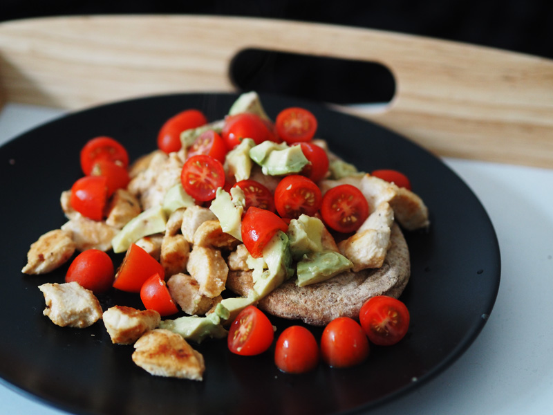 60g celozrná pita M&S, 15g avokádo, 100g rajčata, 150g restovaná kuřecí prsa naložená v 5g PB2 (práškové burákové máslo)