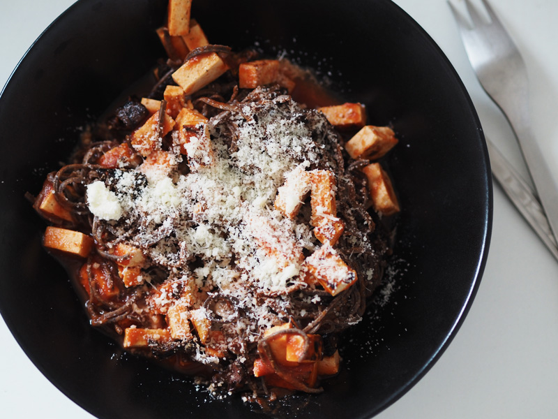 50g proteinové těstoviny z černých fazolí, 200g rajčatové pyré, 85g šmakoun, 20g sušená rajčata, 5g parmezán