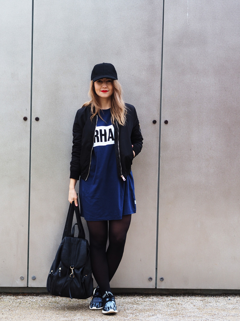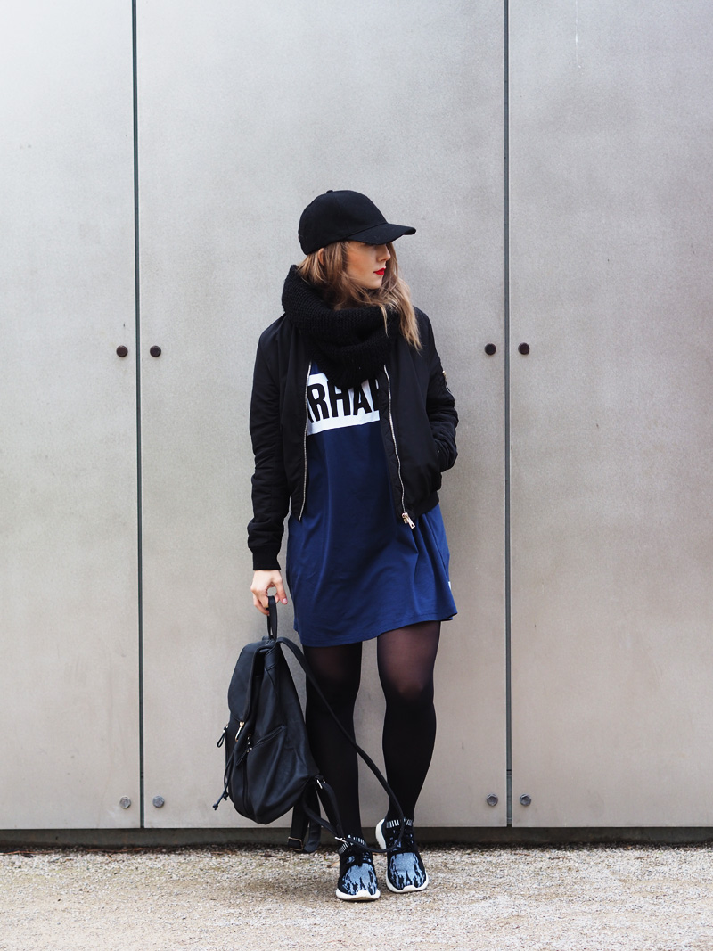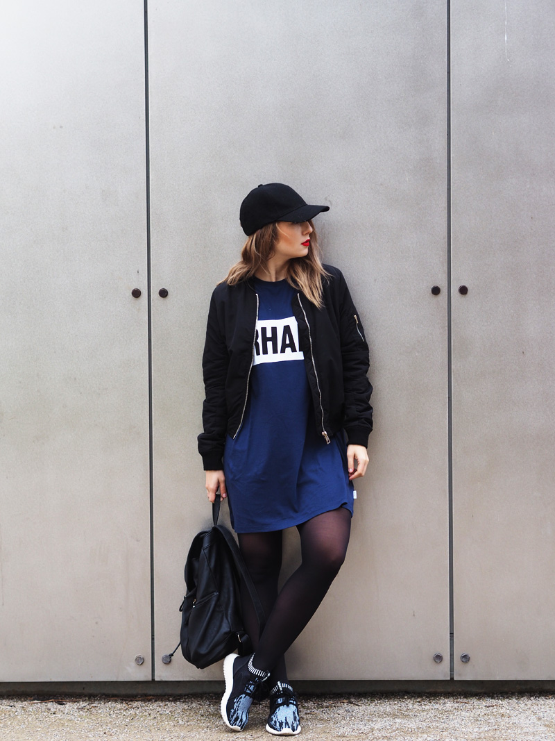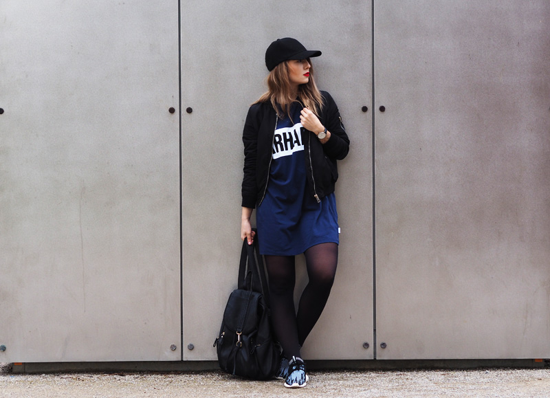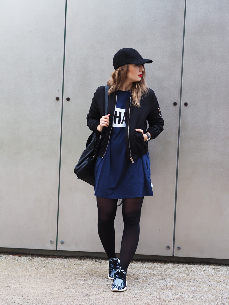 V minulým článku jste si mohli všimnout dvou fotek nepublikovanýho outfitu – no a s tím se hlásím právě teď. Myslím si totiž, že tyhle cool šaty si rozhodně samostatnej post zasloužej. Navíc si myslím, že moje střídání stylů vás dost baví a tak není na škodu přidat zas jeden hodně sportovní outfit. Volný šaty s velkým nápisem snad ani jinou kombinaci nedovolujou. Proto jsem je zkombinovala s nejnovějším botovým přírůstkem – Tubularama, který jsem chtěla fakt dlouho, ale ne a ne narazit na tu konkrétní variantu, která by mě dostala a pak najednou BUM – Woodies, jako obvykle! K tomu bomber a batoh, protože kabelek mám už plný zuby, pletenej límec od babičky, kterej mi celý odpoledne kradl Kuba a kšiltovka, kterou pro změnu od Kuby mám. Z pánský Zary a je nej, protože jde jak k sportovnímu, tak k elegentnímu a já jsem ten typ člověka, co místo deštníku nosí zásadně jen čepice, takže ji nejspíš dlouho nesundám z hlavy.