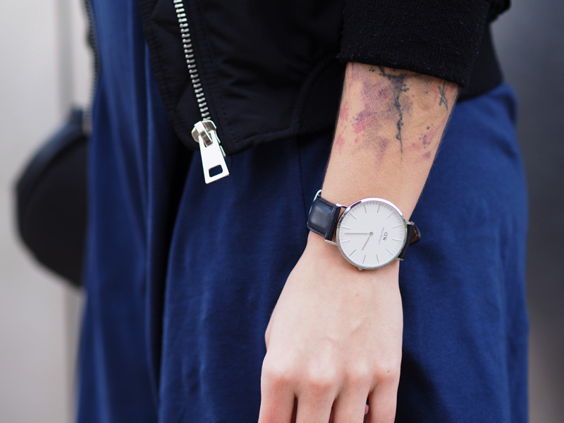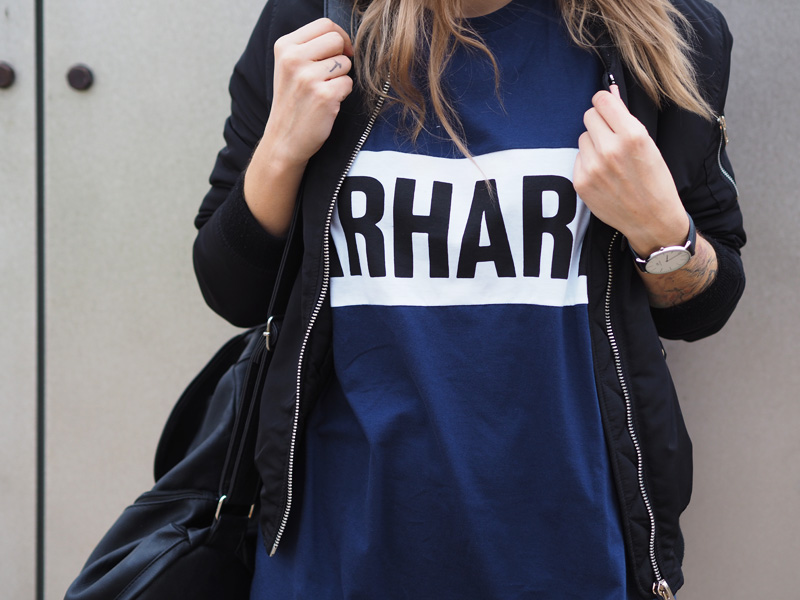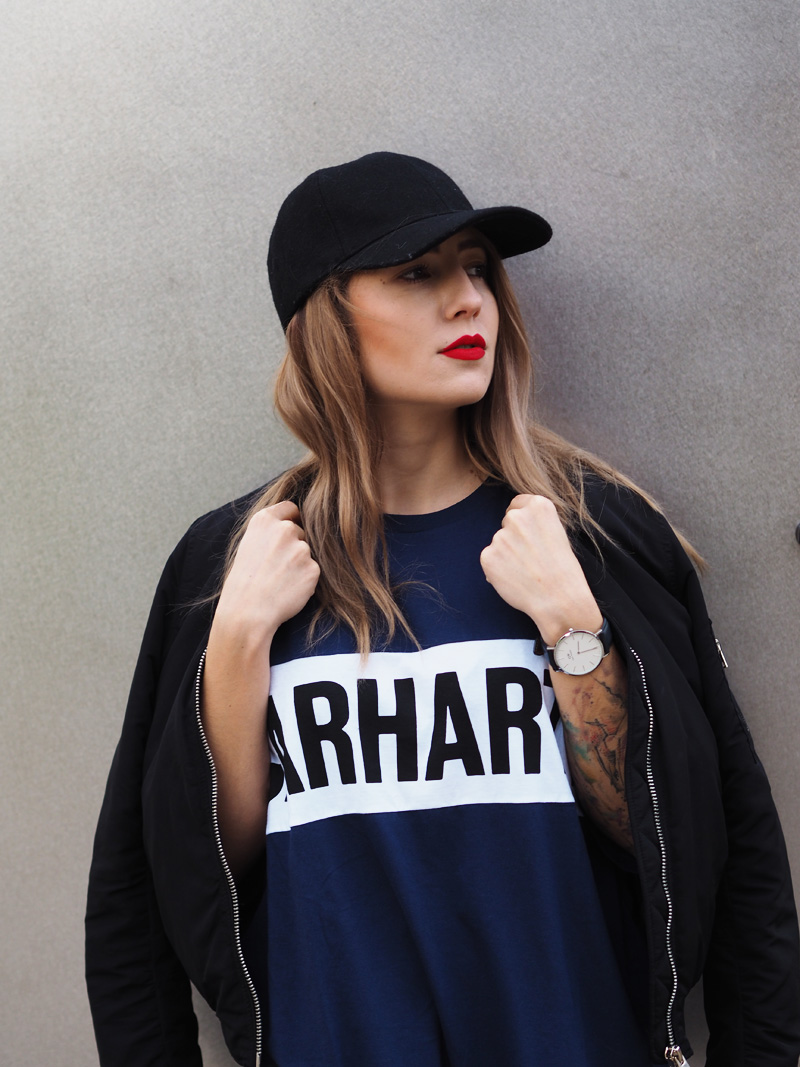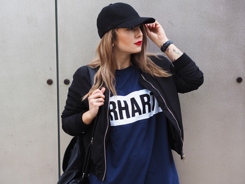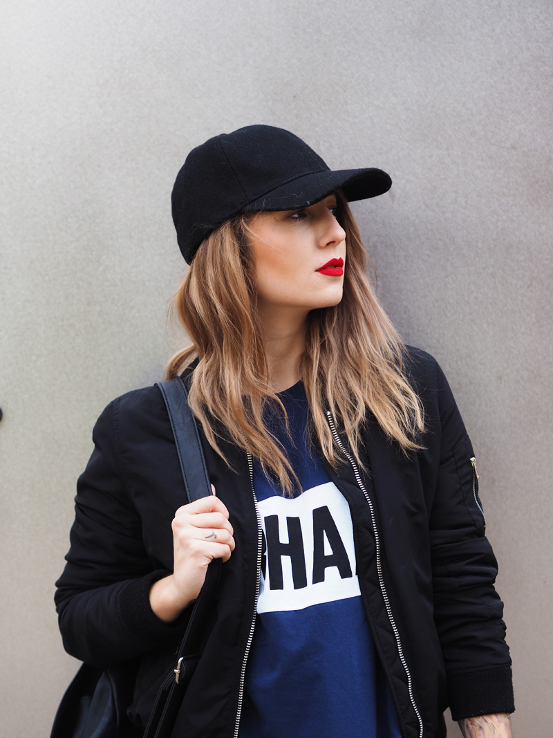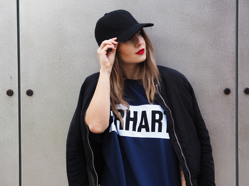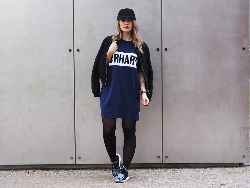 V minulým článku jste si mohli všimnout dvou fotek nepublikovanýho outfitu – no a s tím se hlásím právě teď. Myslím si totiž, že tyhle cool šaty si rozhodně samostatnej post zasloužej. Navíc si myslím, že moje střídání stylů vás dost baví a tak není na škodu přidat zas jeden hodně sportovní outfit. Volný šaty s velkým nápisem snad ani jinou kombinaci nedovolujou. Proto jsem je zkombinovala s nejnovějším botovým přírůstkem – Tubularama, který jsem chtěla fakt dlouho, ale ne a ne narazit na tu konkrétní variantu, která by mě dostala a pak najednou BUM – Woodies, jako obvykle! K tomu bomber a batoh, protože kabelek mám už plný zuby, pletenej límec od babičky, kterej mi celý odpoledne kradl Kuba a kšiltovka, kterou pro změnu od Kuby mám. Z pánský Zary a je nej, protože jde jak k sportovnímu, tak k elegentnímu a já jsem ten typ člověka, co místo deštníku nosí zásadně jen čepice, takže ji nejspíš dlouho nesundám z hlavy.