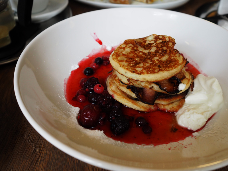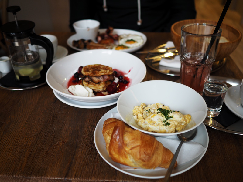 Monolok nás zklamal hned při příchodu neochotnou obsluhou, která na prosbu o rozdělení velkého stolu obsazeného pouze dvěma lidmi reagovala zakroucením hlavou a poslala nás si sednou do sklepa, kterej denní světlo neviděl ani z dálky. To se mně samozřejmě nelíbilo a pral se ve mě hlad s nespokojeností s místem. Na víkendový snídani odmítám sedět někde v umělým osvětlení – prostě ne. Takže jsme se po chvíli váhání zvedli, že půjdem někam jinam a naštěstí se nahoře zrovna uvolnilo místo a naše snídaně tak byla zachráněna. Kuba si dal klasickou anglickou a já krémový míchaný vajíčka s croissantem a lívance s lesním ovocem a slaninou, o který jsme se nakonec dělili, protože jsem měla jako obvykle velký voči. Ta kombinace byla hodně zvláštní, ale fakt chutná. Vlastně všechno bylo naprosto vynikající – včetně švestkový limonády, kterou vybral Kuba a na kterou myslím doteď.