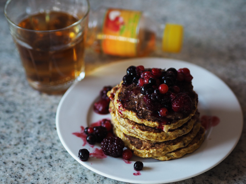 Ke snídani si se železnou pravidelností dělám banánový lívance. Tady zrovna s rozehřátým lesním ovocem a sklenicí 100% džusu. Džusům jsem se dlouho vyhýbala, protože jsem žila v tom, že jsou plný éček a přidanýho cukru. Z tohohle omylu jsem ale byla nedávno vyvedená a nedá mi to to s vámi nesdílet. Do 100% džusů je totiž podle evropských zákonů zakázáno přidávat jakýkoliv barviva, cukr, dochucovadla nebo konzervanty. Jsou čisté, přírodní a plné vitamínů. Pokud tedy nestíháte svačiny a nesníte tak denně doporučené množství pěti porcí ovoce a zeleniny, jsou právě džusy (nebo pyré) skvělou variantou, jak do sebe dostat potřebné vitamíny. A navíc je to dobrota!