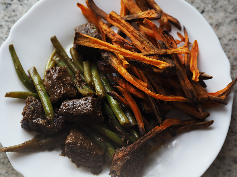 K obědu jsem si upekla batátový hranolky a mamka mi nachystala moje milovaný hovězí s fazolkama. To já můžu. Na kuřecí a krůtí maso mě moc neužije a doma si ho odmítám dělat, nějak se mi to přejedlo, zatímco tohle je pro mě nebe v puse!