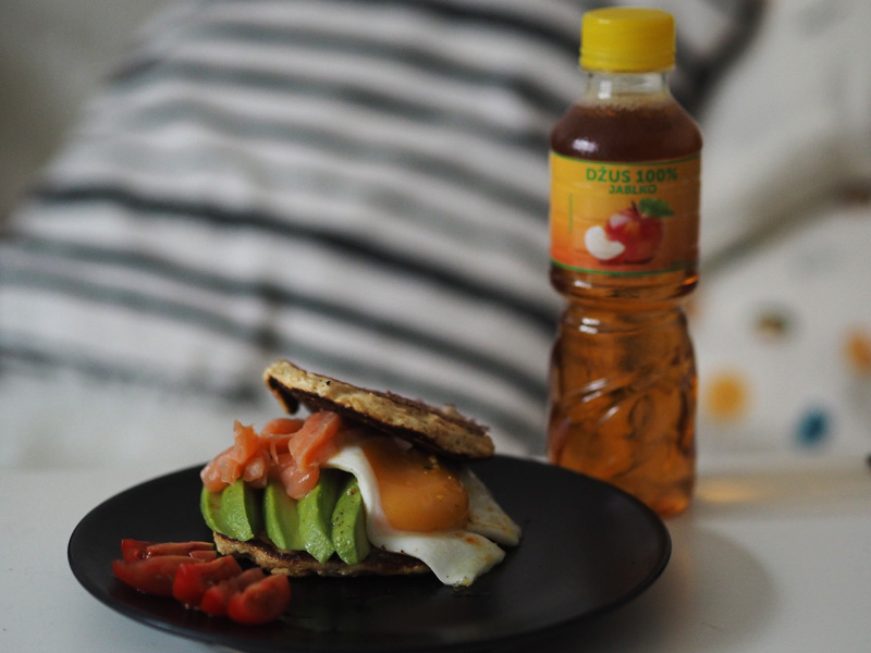 Doma pak ještě padly slaný lívance s vajíčkem, avokádem a lososem s další trochou džusu.