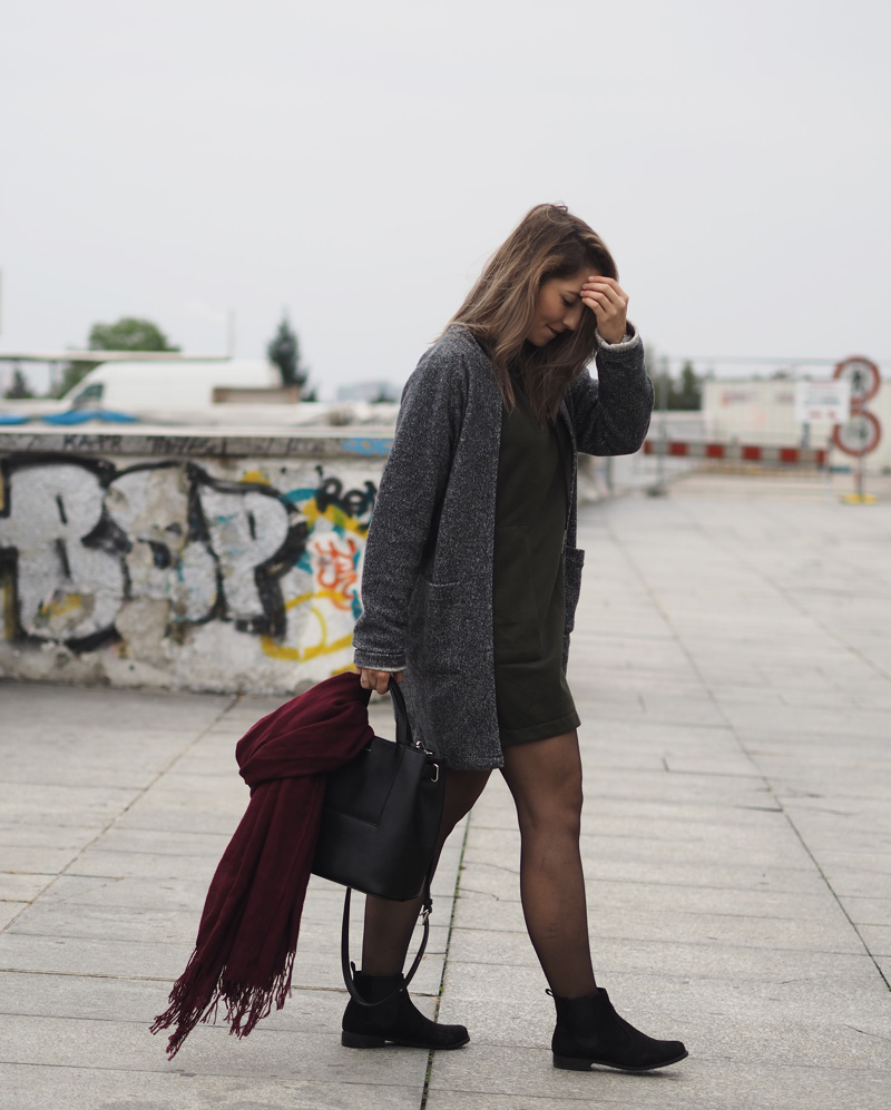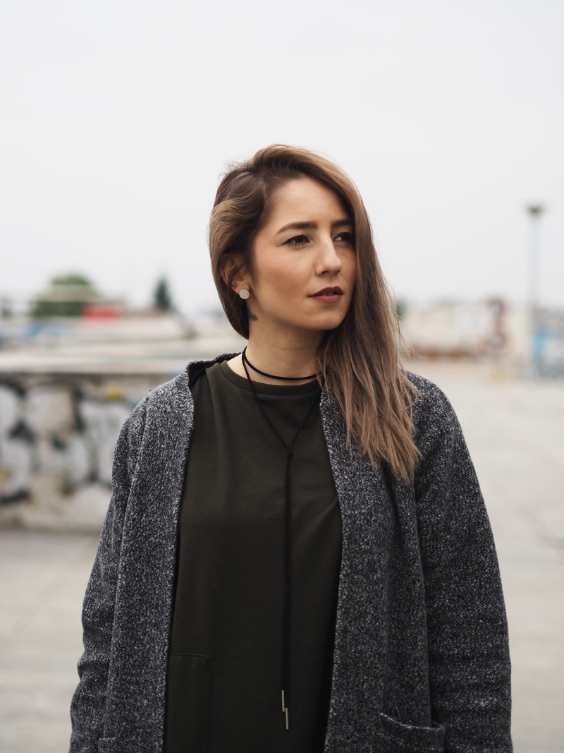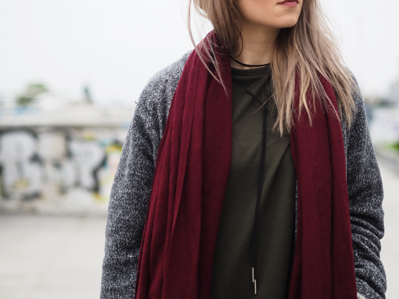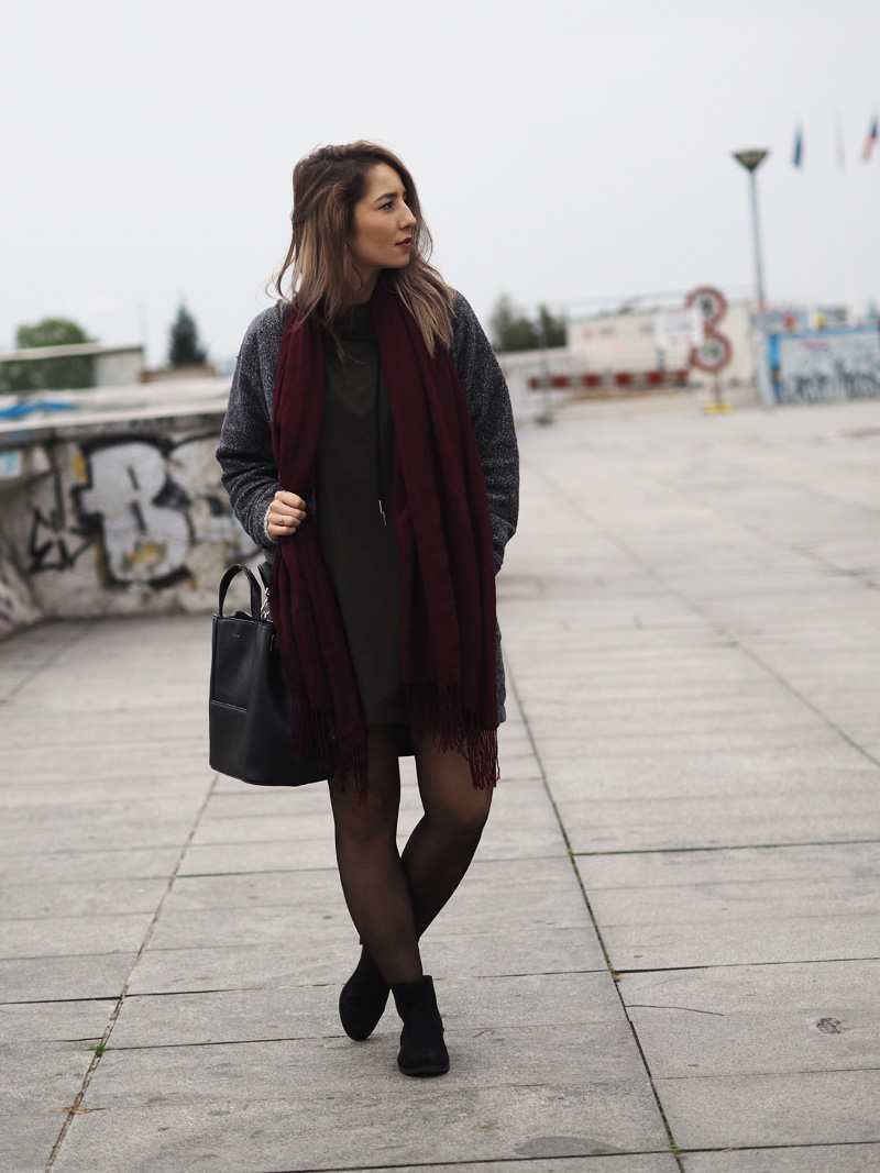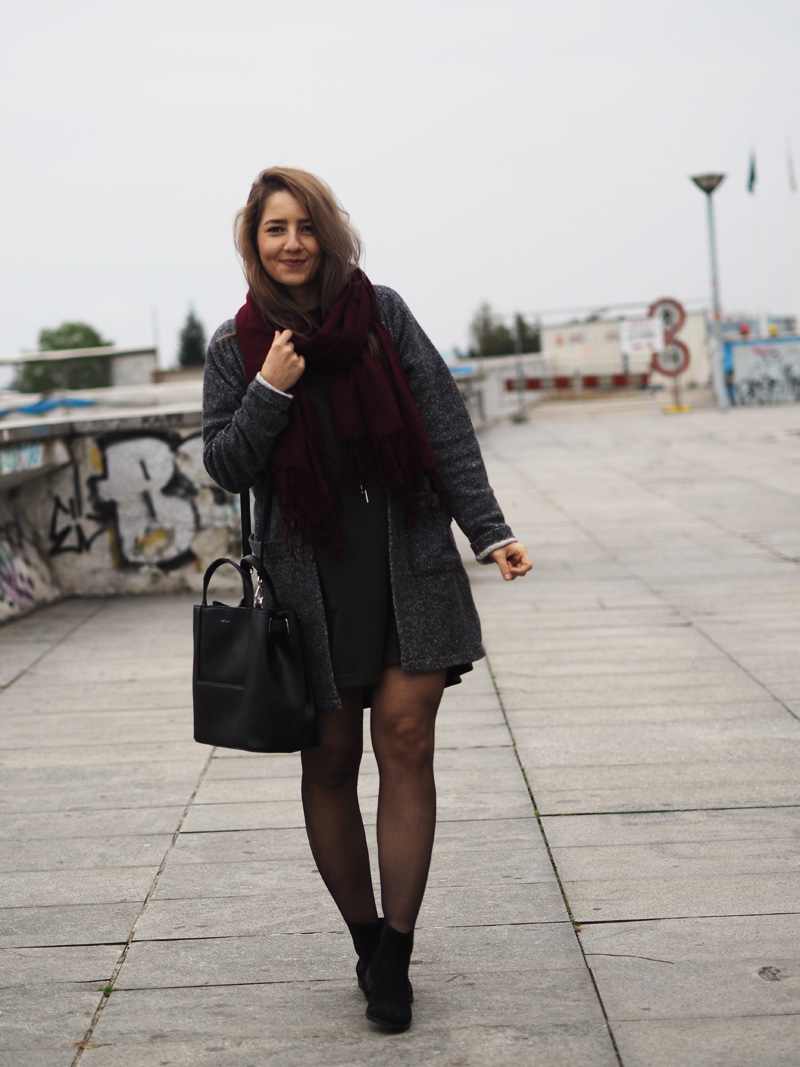 Existujou víc podzimní barvy než khaki a burgundy? Podle mě teda ne. Tyhle dvě barvy jsou pro mě jedním z důvodů, proč mám ráda podzim. Přesně takovýhle outfity bych mohla nosit každej den, jsou totiž maximálně pohodlný, nikde nic netlačí ani nepne a zároveň jsou stylový. Oversized šaty ze Zary jsou navíc mým nejmilejším přírůstkem v šatníku za poslední týdny a trošku mě mrzí, že je nevidíte v plný kráse. Nicméně i kombinace s kabátem a šálou jim sluší, že jo? No a choker nosím ke všemu, k čemu se aspoň trochu ladí a považuju ho za nejgeniálnější doplněk.