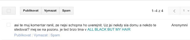 z čehož se mi, myslím naprosto logicky, udělalo zle a nechápala jsem, jak tohle může někdo napsat, byť pod anonymem. Myslím, že jste si tady všichni stačili všimnout, že zveřejňuju i negativní komentáře, kritiku a kolikrát i útoky na svojí osobu. Pokud se ale jedná o něco, co je až sprostý a nechutný, nemám důvod to povolovat a dávat něco takovýho na svůj blog. To by snad měl pochopit každý a jestli je adekvátní reakcí takováhle výhružka, tak nevím, v jakým světě to žijeme.