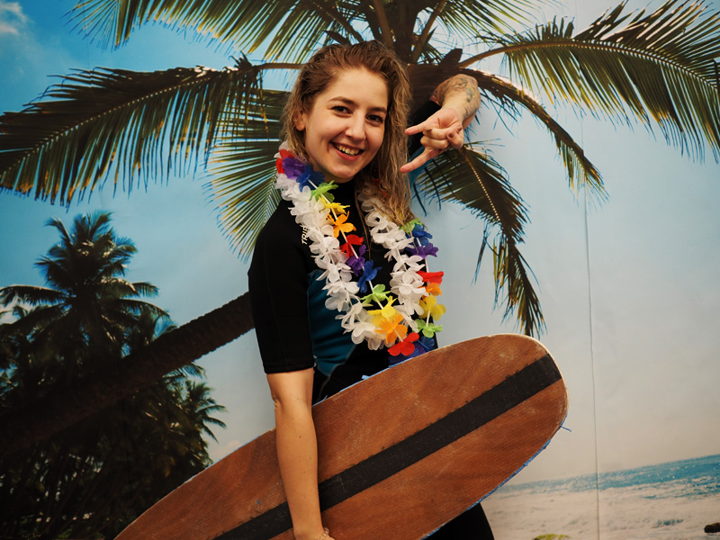 Tady vidíte kromě jedný ostřílený surfařky mě i jak to vypadá, když koupíte zážitek jen svýmu partnerovi. Můžete sedět v kavárně a pěkně v suchu se smát tomu, jak každou chvíli zahučí do vody a hádat, jestli to tentorkát bude po hubě nebo po zádech.