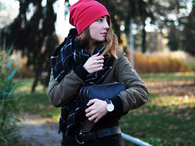 Nechápu, jak se stalo, že tyhle fotky, který se mi mimochodem fakt strašně líběj (děkuju Baru!), se tady ocitají až teď, přitom jsou focený tak měsíc zpátky. Byl to takovej ten první záchvěv zimy a já jsem zrovna měla poměrně novej bomber, kterej je snad mým nejoblíbenějším kusem v šatníku za celej podzim a zimu. Pořídila jsem ho ve Stradivariu a pak si vyčítala, že jsem si ho nevzala ještě aspoň v černý nebo vínový, je totiž fakt boží a nestál ani 800,-. K němu šálu, kterou mám už několik týdnů přirostlou ke krku a nejradši bych v ní chodila i doma. No a ta červená čepka? Tu jsem koupila kdysi bráchovi v Anglii a protože ji doteď ani jednou neměl na sobě, zabavila jsem si ji pro sebe. Občas si v ní připadám jako kuchař, ale cítím se v ní strašně dobře – jako ostatně teď ve všech čepicích a tu nejlepší tady teprve uvidíte <3.