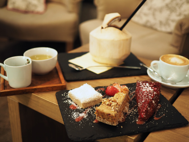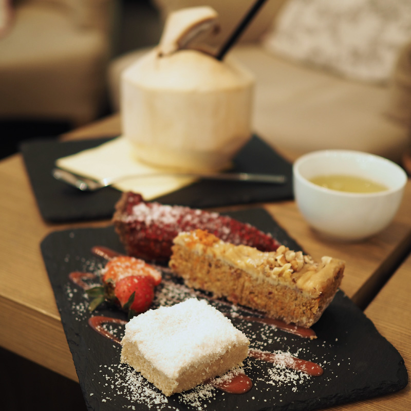 Oslavit zkoušku jsem pak vyrazila za Nikčou do My Raw Café, kam jsem se těšila už dva týdny. Měla jsem v plánu si tam dát obědový menu nebo něco slanýho jakoby oběd, ale opět jsem neodolala degustačnímu menu zákusků, protože tam měli samý novinky. A k pití opět mladý kokos a genmaichu – fakt tenhle zelenej čaj s praženou rýží zkuste, já na něm totálně ujíždím.