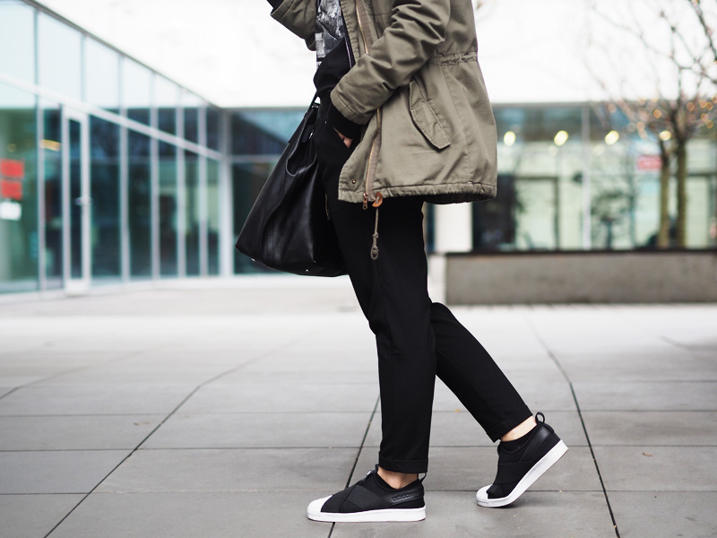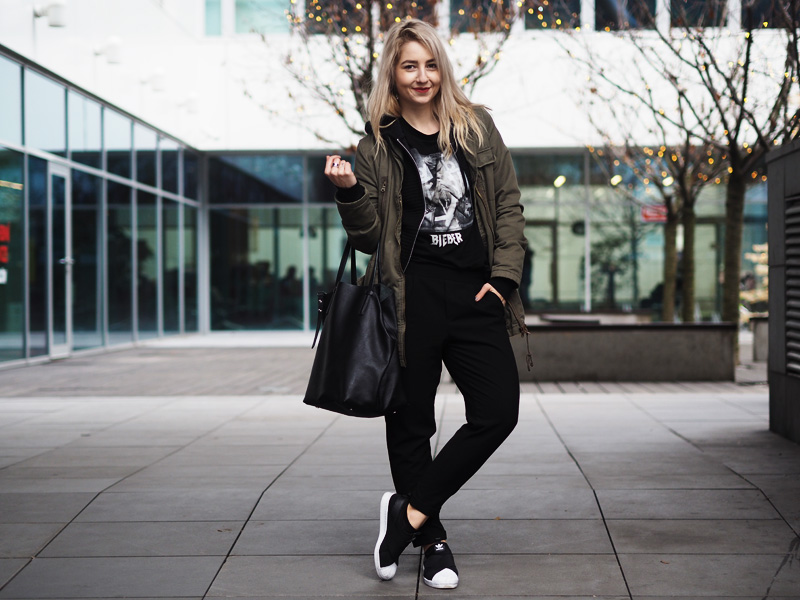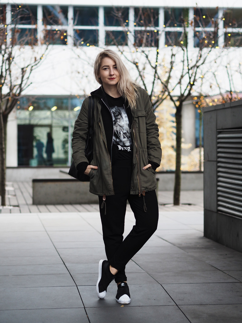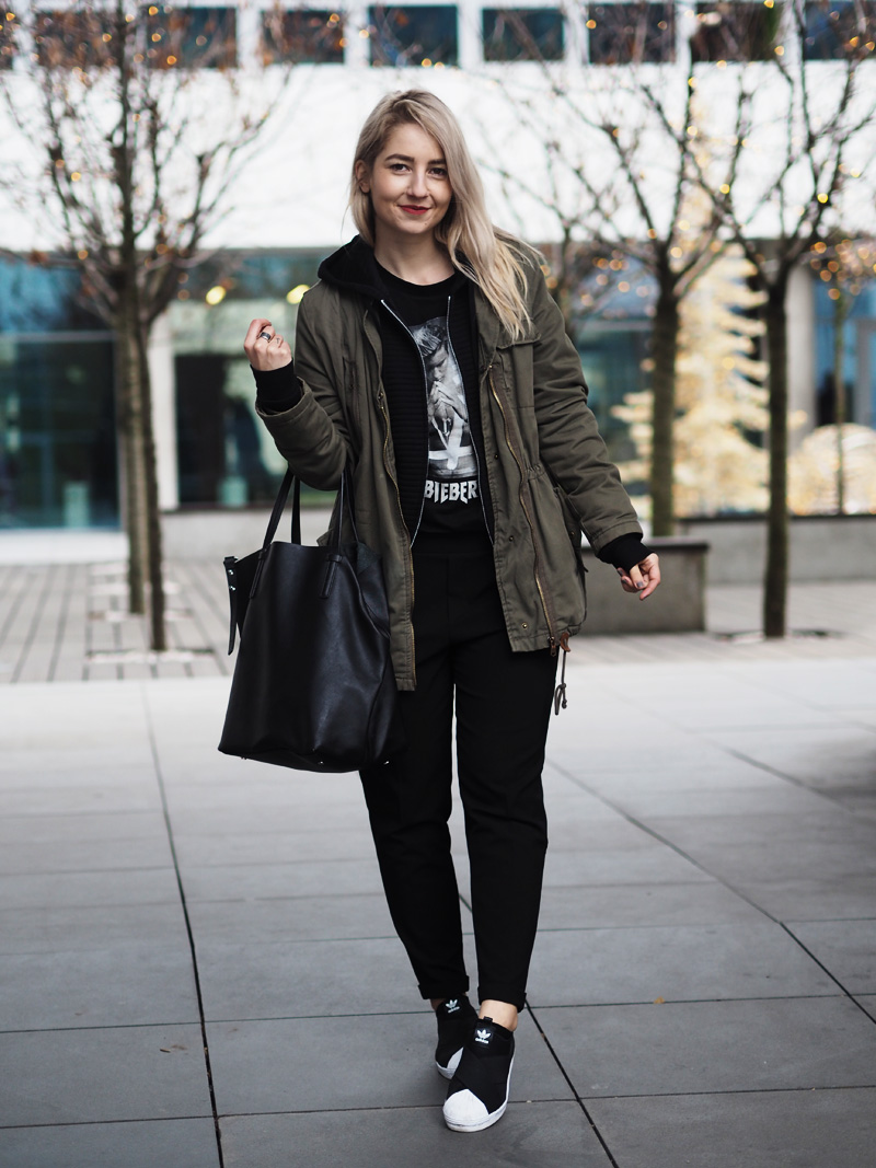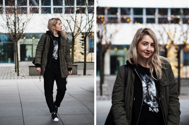 Parka, triko – H&M / mikina – TEZENIS / kalhoty – BERSHKA / boty – ADIDAS (WOODIES) / kabelka – MANGO OUTLET