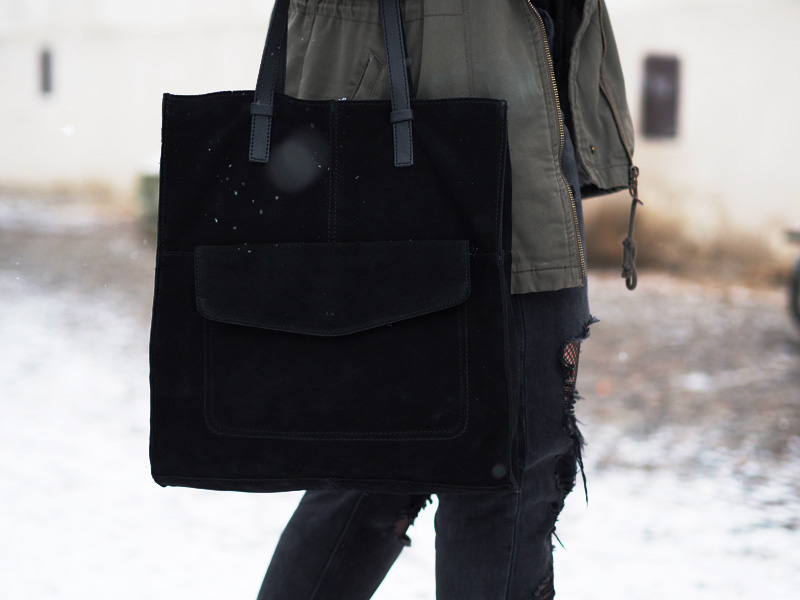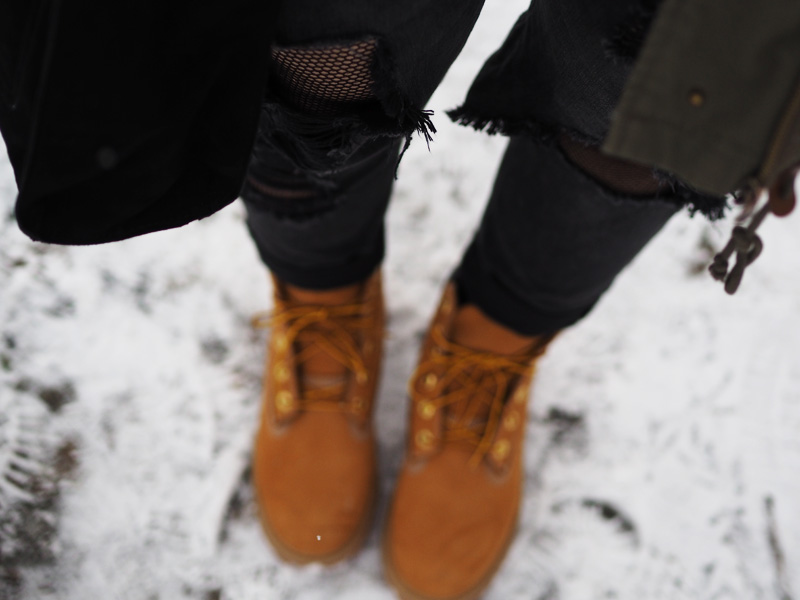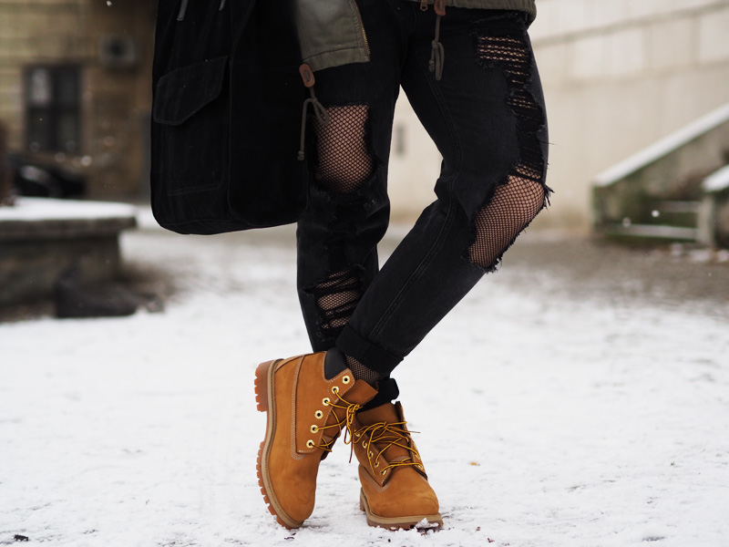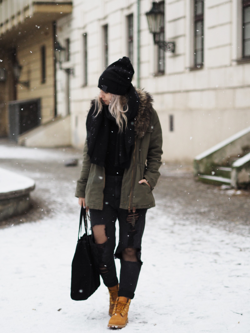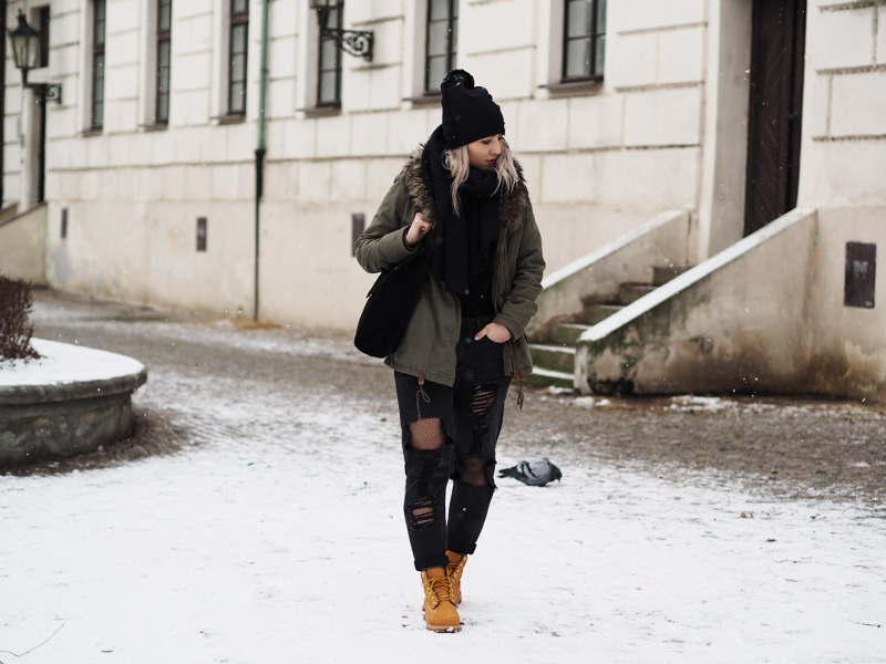 Dál už bych asi prokrastinovat neměla, takže popojem k outfitu. Na instagramu jste mi psali, že jste zvědaví, jak budu kombinovat Timberlandy, tak jsem vám hned ten první outfit nafotila. Kromě těhlech super stylovejch zimních bot (podotýkám, že v Office Shoes na ně teď mají 30% slevu a to mě právě rozhoupalo k jejich koupi) bych zmínila i zbytek věcí. Kabelku jsem dostala od mamky k Vánocům, protože jsem fakt potřebovala nějakou černou a kvalitní, šálu jsem ukradla příteli, protože se mi hodí k čepici, vzhledem k tomu, že je od stejnýho návrháře a ze stejný kolekce a síťovaný punčochy pod roztrhaný kalhoty, jsou myslím poměrně novodobej trend, co se teď začal různě objevovat a mě to fakt baví. Je to skvělej detail, co udělá z obyčejnýho outfitu neobyčejnej a podle mě to vypadá fakt dobře. Co myslíte vy?