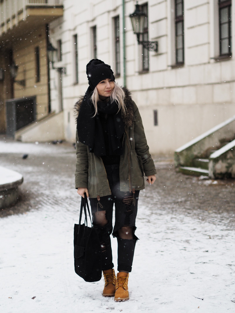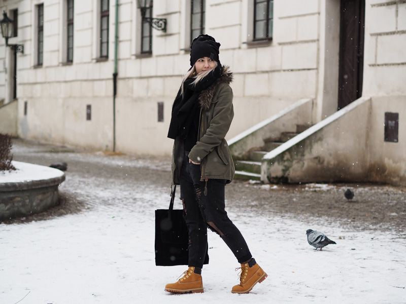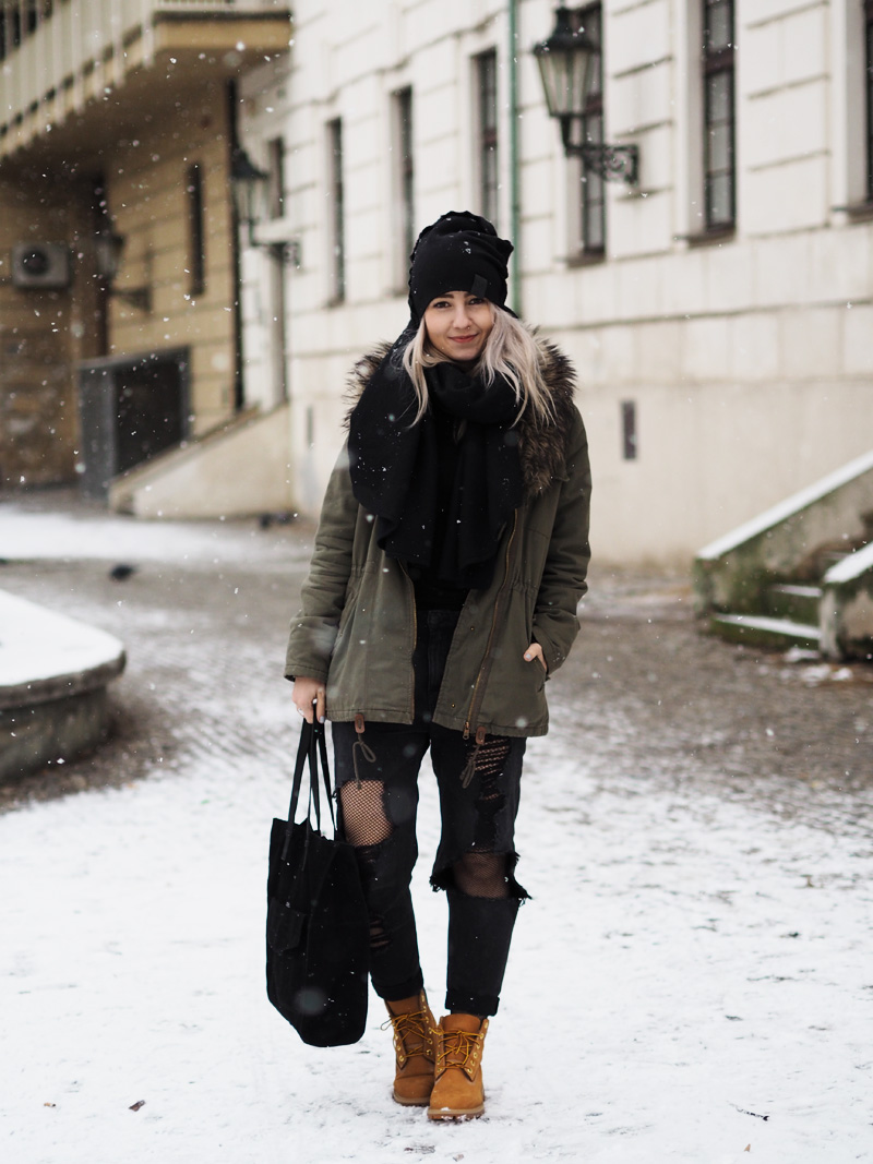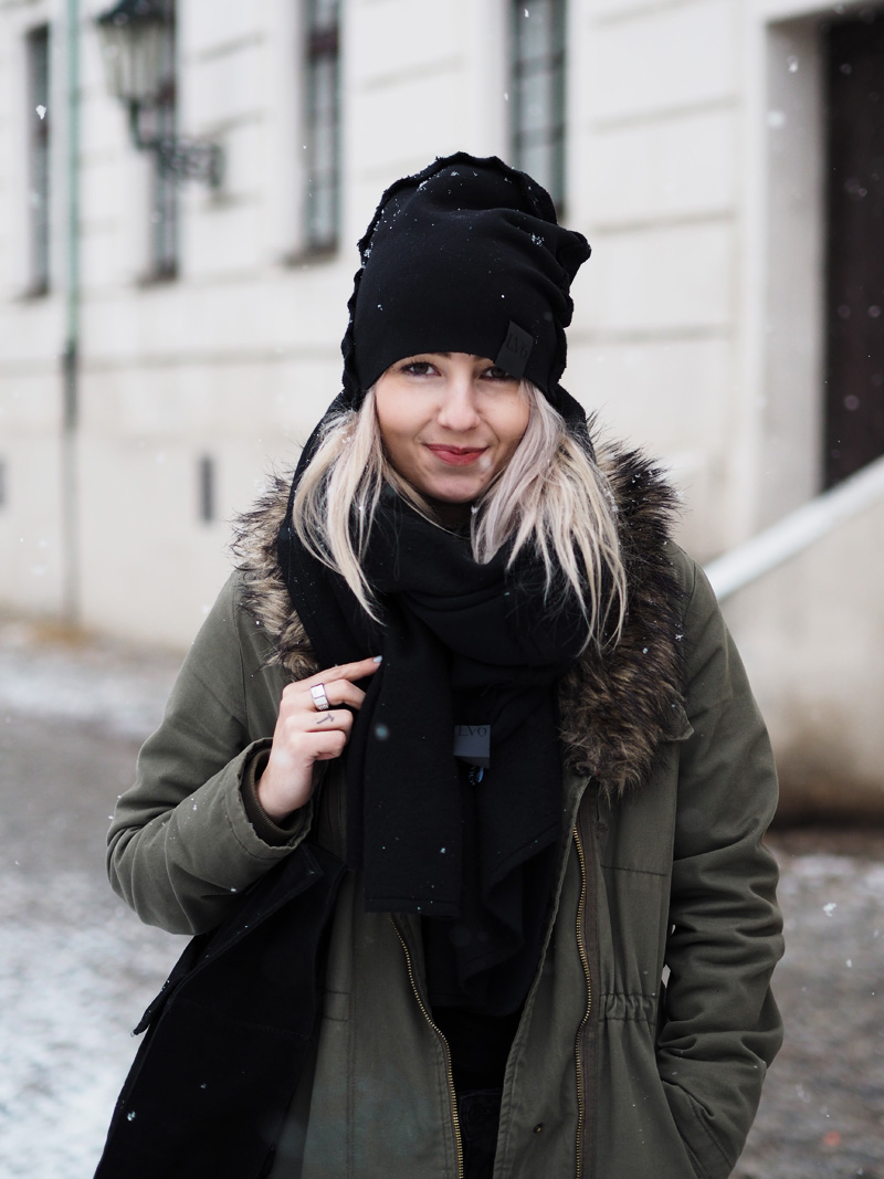 Parka, rolák, kalhoty – H&M / kabelka – MANGO / silonky – TEZENIS / boty – TIMBERLAND (OFFICE SHOES) / šála a čepice – MCONCEPT LUKÁŠ MACHÁČEK / prstýnek – CALVIN KLEIN