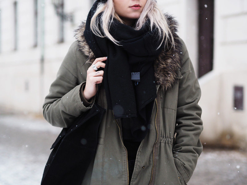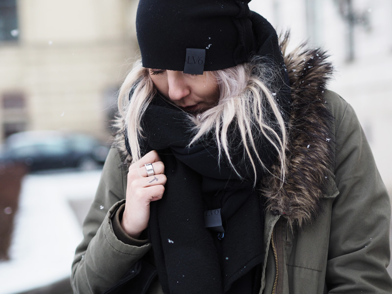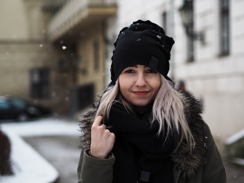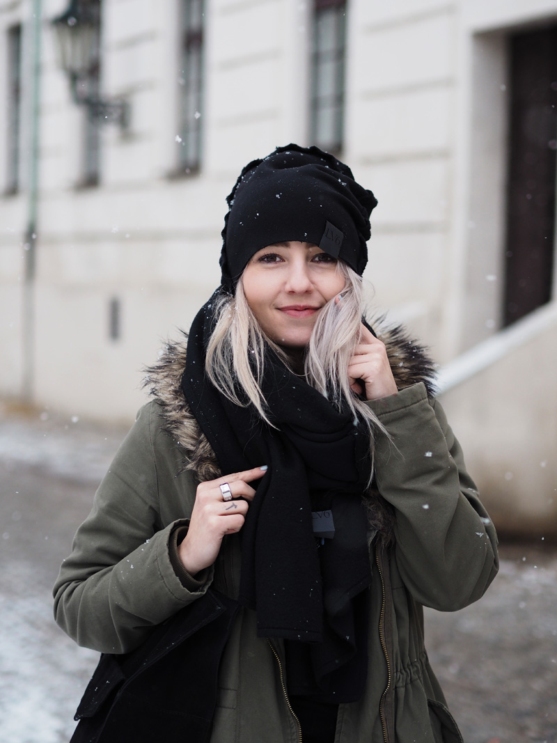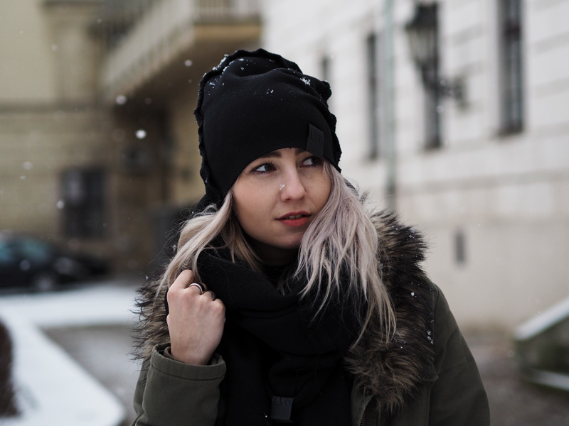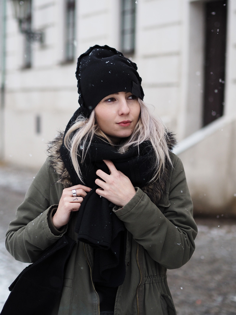 Parka, rolák, kalhoty – H&M / kabelka – MANGO / silonky – TEZENIS / boty – TIMBERLAND (OFFICE SHOES) / šála a čepice – MCONCEPT LUKÁŠ MACHÁČEK / prstýnek – CALVIN KLEIN