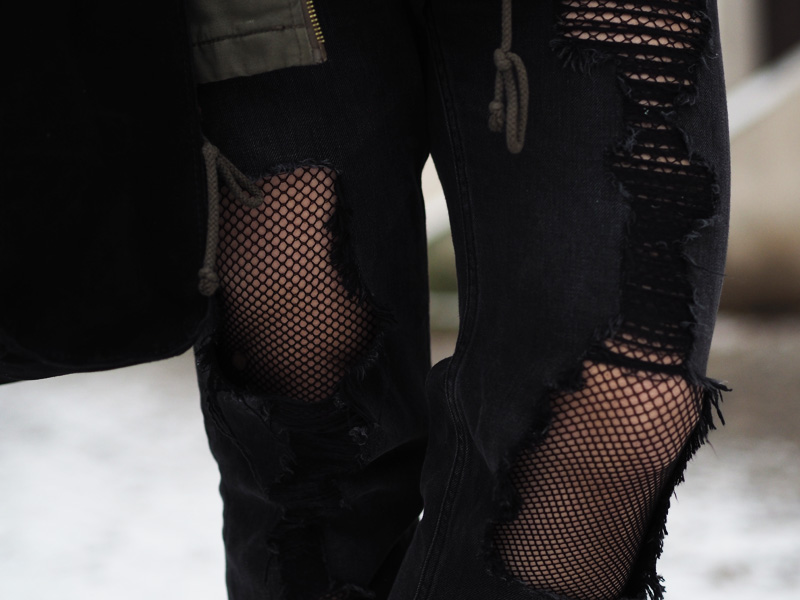 Síťované silonky pod děravýma kalhotama je podle mě skvělý nápad, to se zase někomu podařilo rozjet supr modu:) a ještě jak máš ty díry takhle velké, tak to vypadá fakt moc dobře 🙂