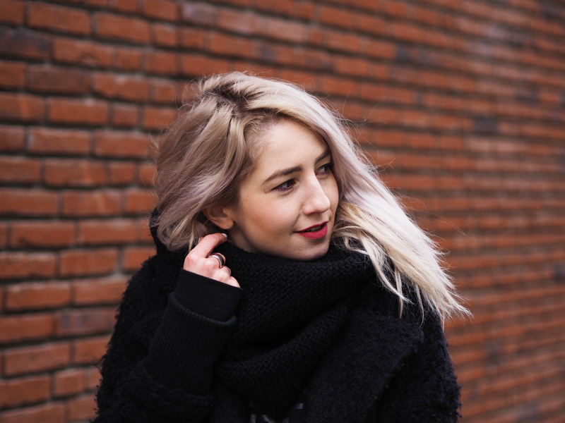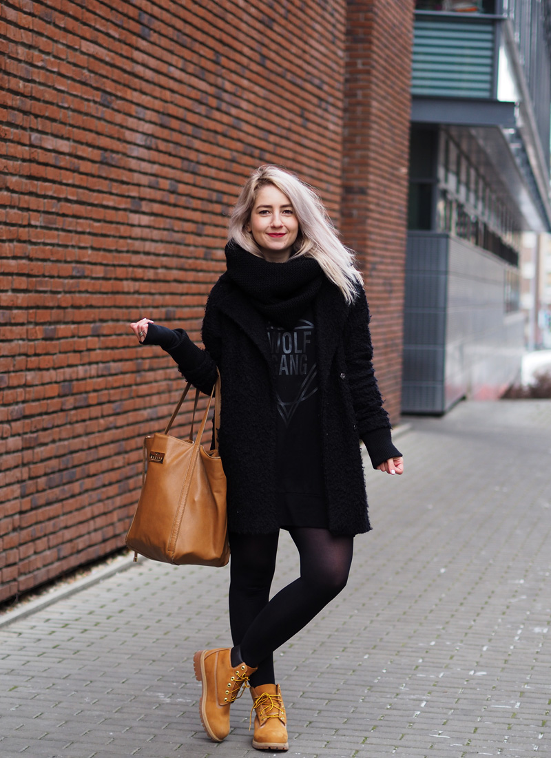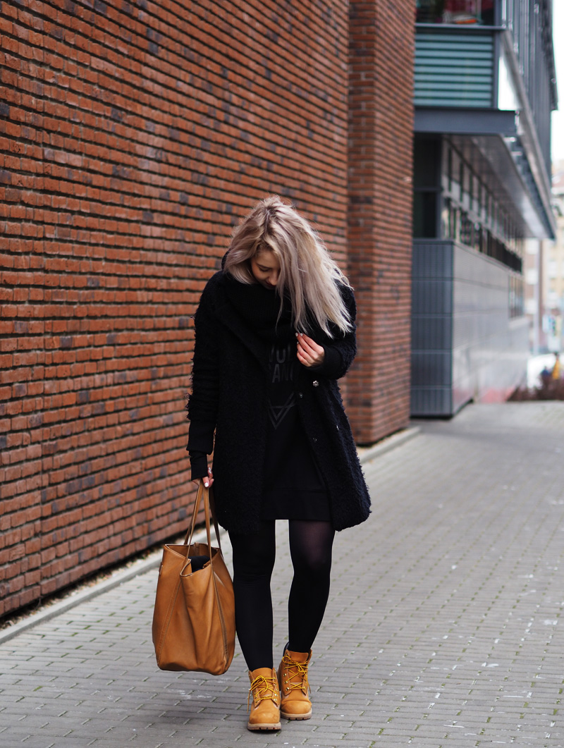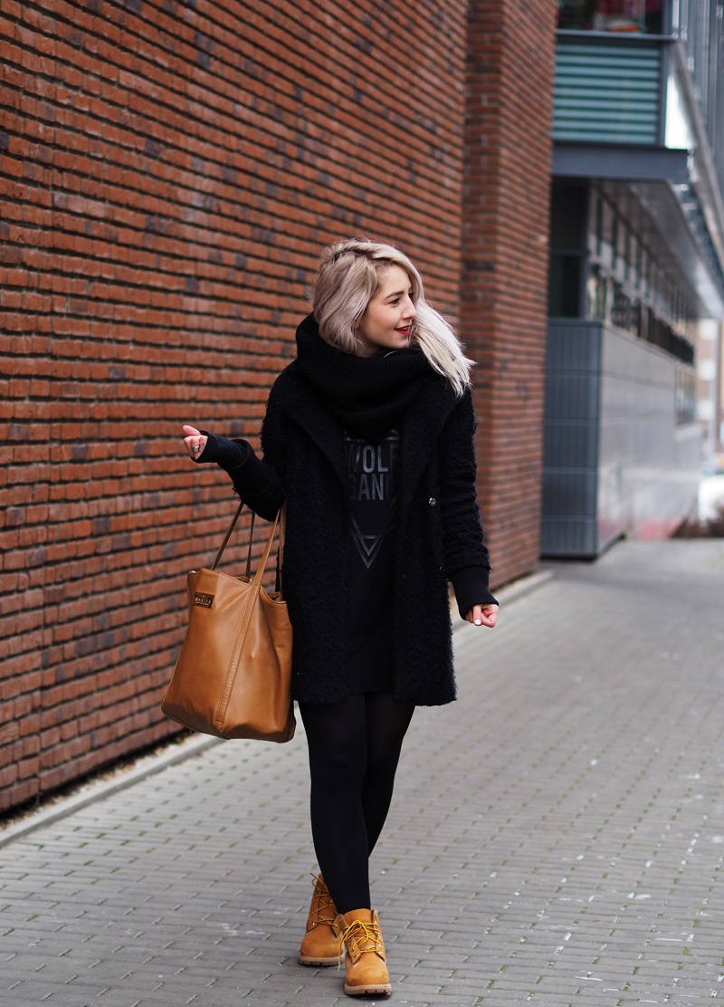 Kabát – GATE (to není zrovna ta ukázka kvality, ale ukořistila jsem ho před pár lety ve slevách za asi 250,- a furt drží, takžeeee :))) / mikinošaty – WOLFGANG / boty – TIMBERLAND (OFFICE SHOES) / kabelka – MOHITO / rtěnka – THE BALM / límec – UPLETENEJ OD BABIČKY ❤