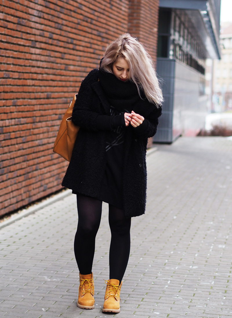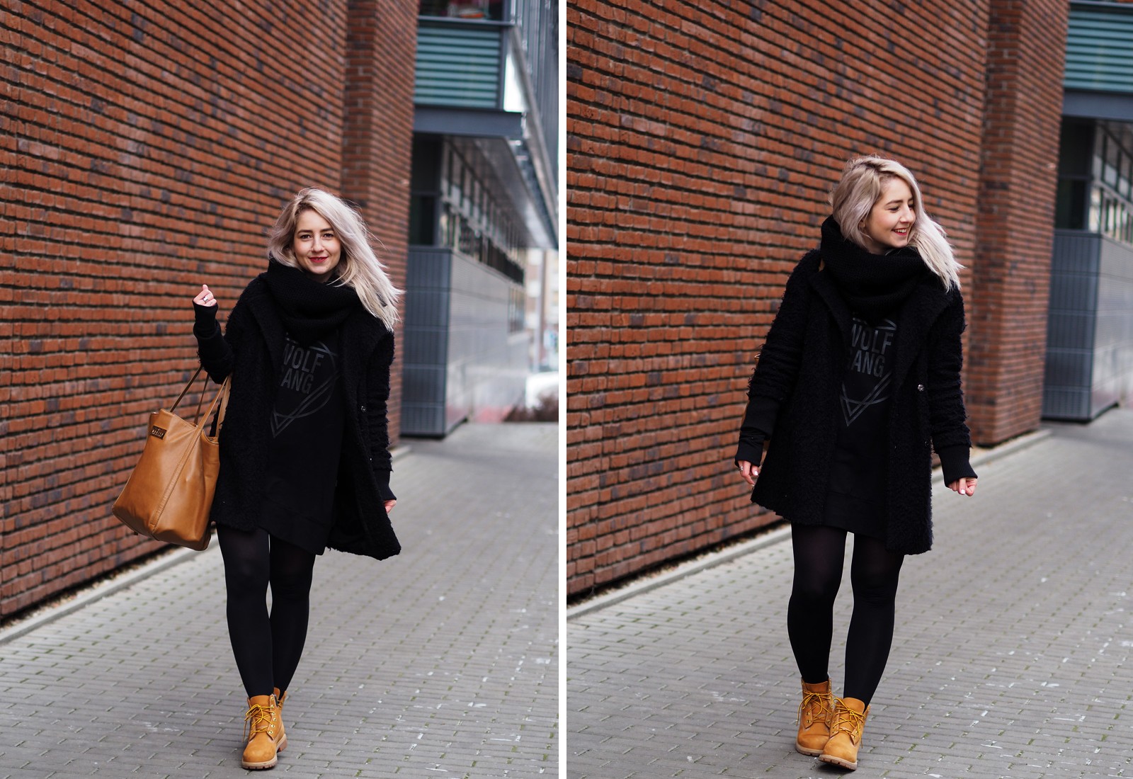 Za mne tak napůl – ty boty se mi k tomu moc nelíbí. Stejně jako postoj špičkami bot k sobě (na čtvrté fotce zdola). Kabát a límec super, mikinošaty taky nejsou špatný.