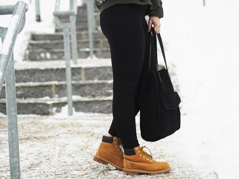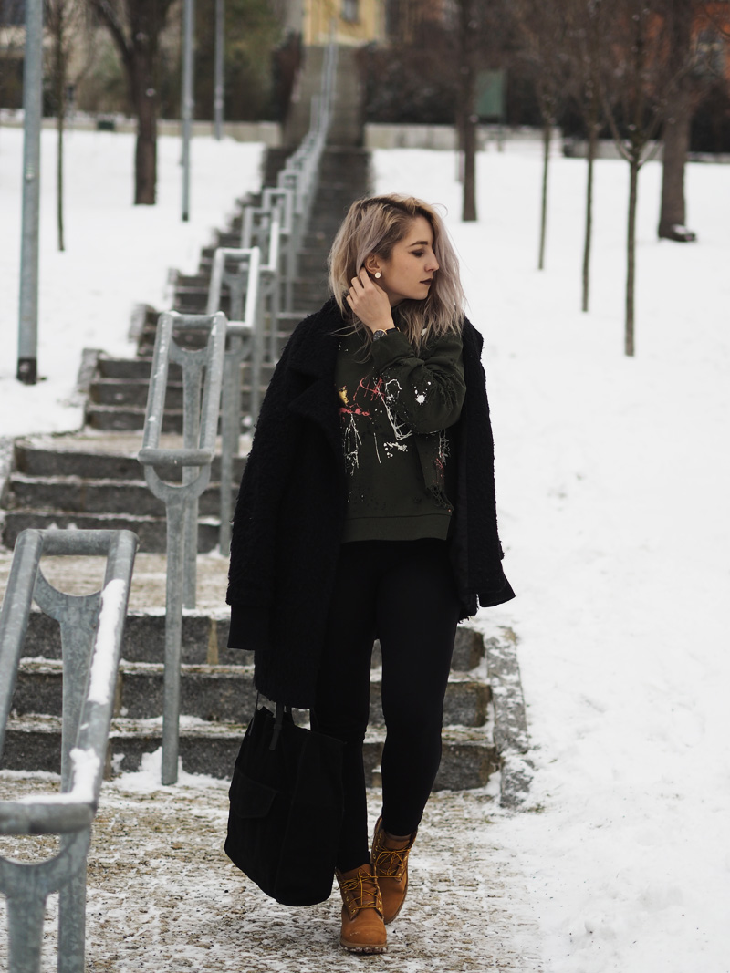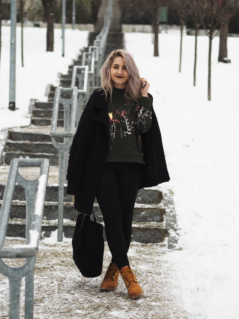 Kabát – GATE / kalhoty – NEJLEGÍNY / mikina – ZARA / kabelka – MANGO / boty – TIMBERLAND / hodinky – DW (pánská velikost) / rtěnka – matná tekutá MAC (odstín SO ME)