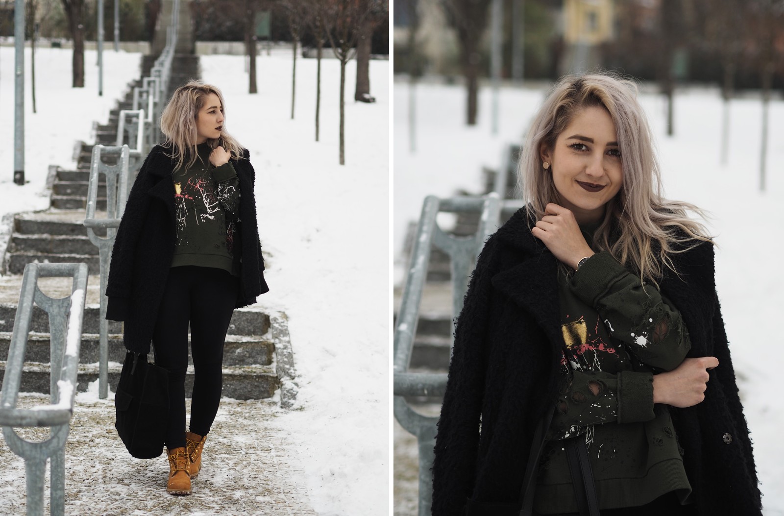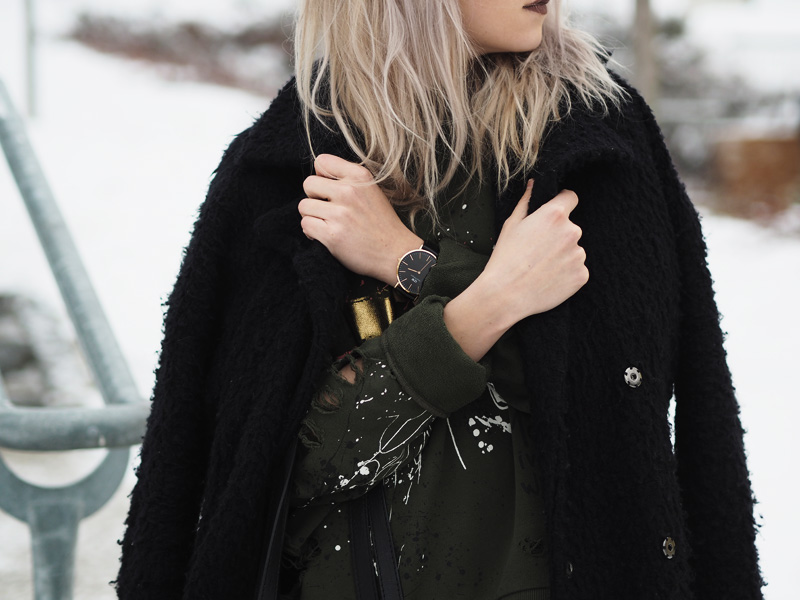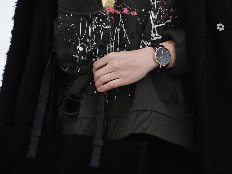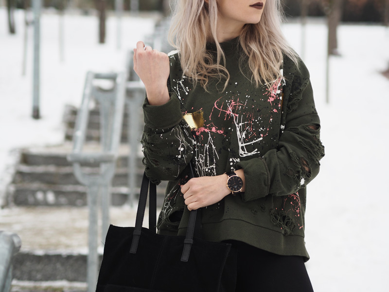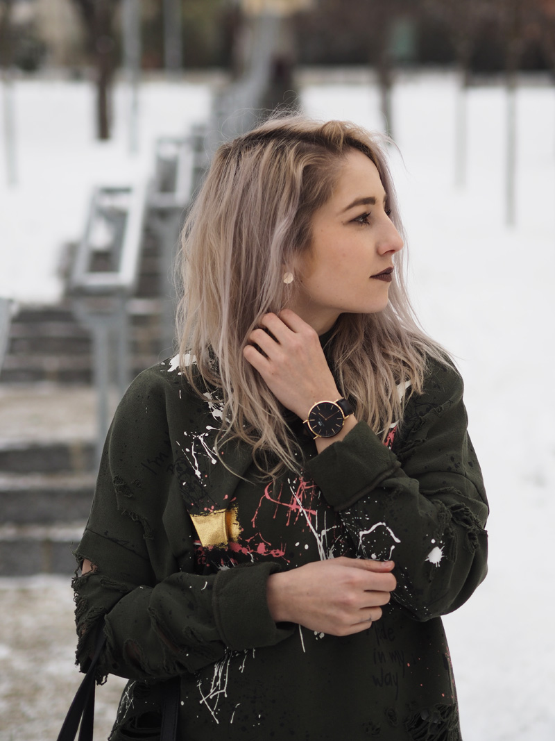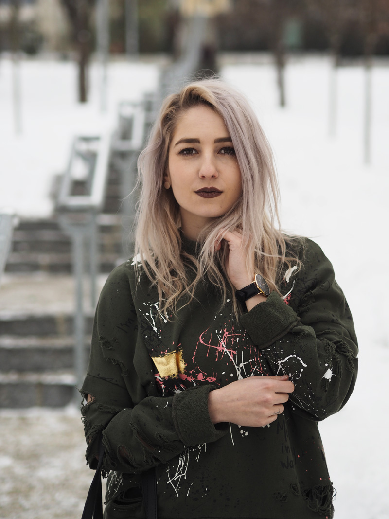 Tak dnes pěkně kontrastně k minulýmu outfitu – ze světla pěkně na tmavo. V hlavní roli je dnes mikina, která byla v Zaře mojí láskou na první pohled, na cákance jsem ujetá a na khaki barvu taky, takže by bylo divný, kdybych se do tohohle kusu nezamilovala. Z fotek je mi pěkná zima ještě teď a to jsou focený už nějakej ten týden zpátky, když byl ještě všudypřítomnej zmrzlej sníh. Vůbec bych se nezlobila, kdyby se to přehodilo do jara a mohla bych zazimovat všechny kabáty zimní věci. Aktuálně je v u nás v plným proudu stěhování, tak bych ty kabáty rovnou šoupla do úložných prostor a slavnostně vytáhla všechny starý i nový tenisky, kožený bundy a trenchcoaty, omggg, prosím, prosím, ať už to je! Taky se už se toho jara nemůžete dočkat?