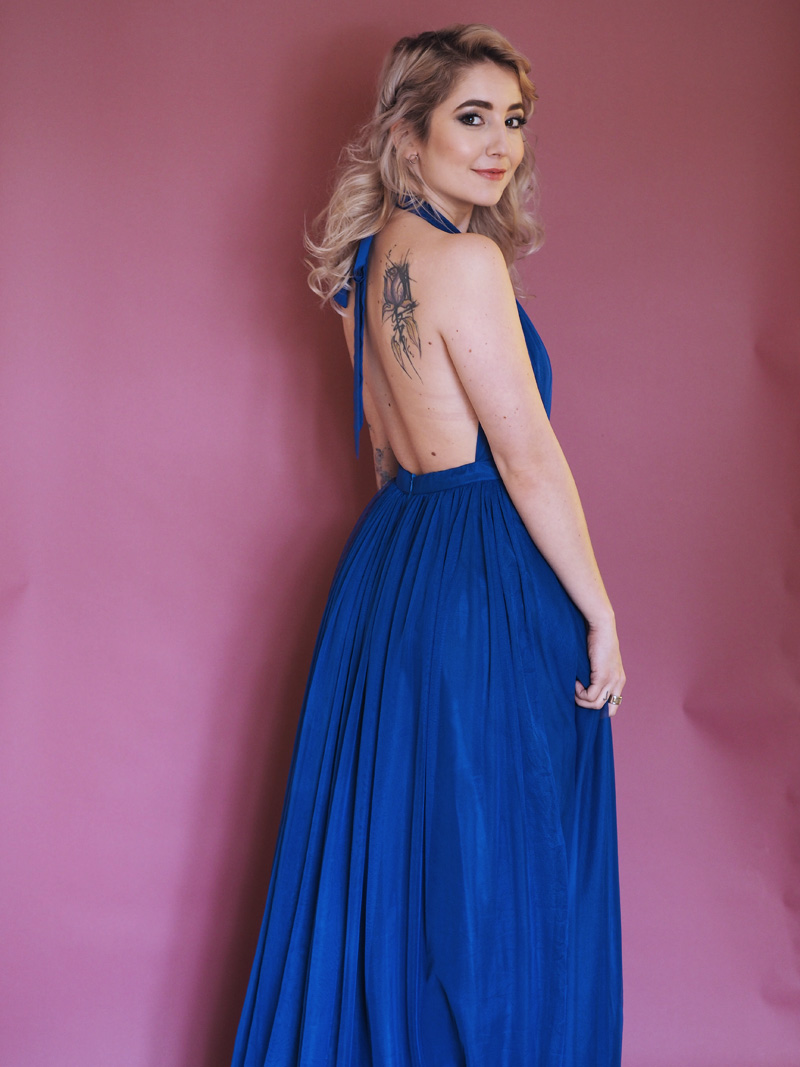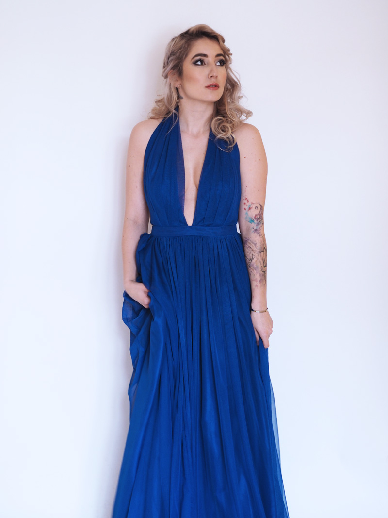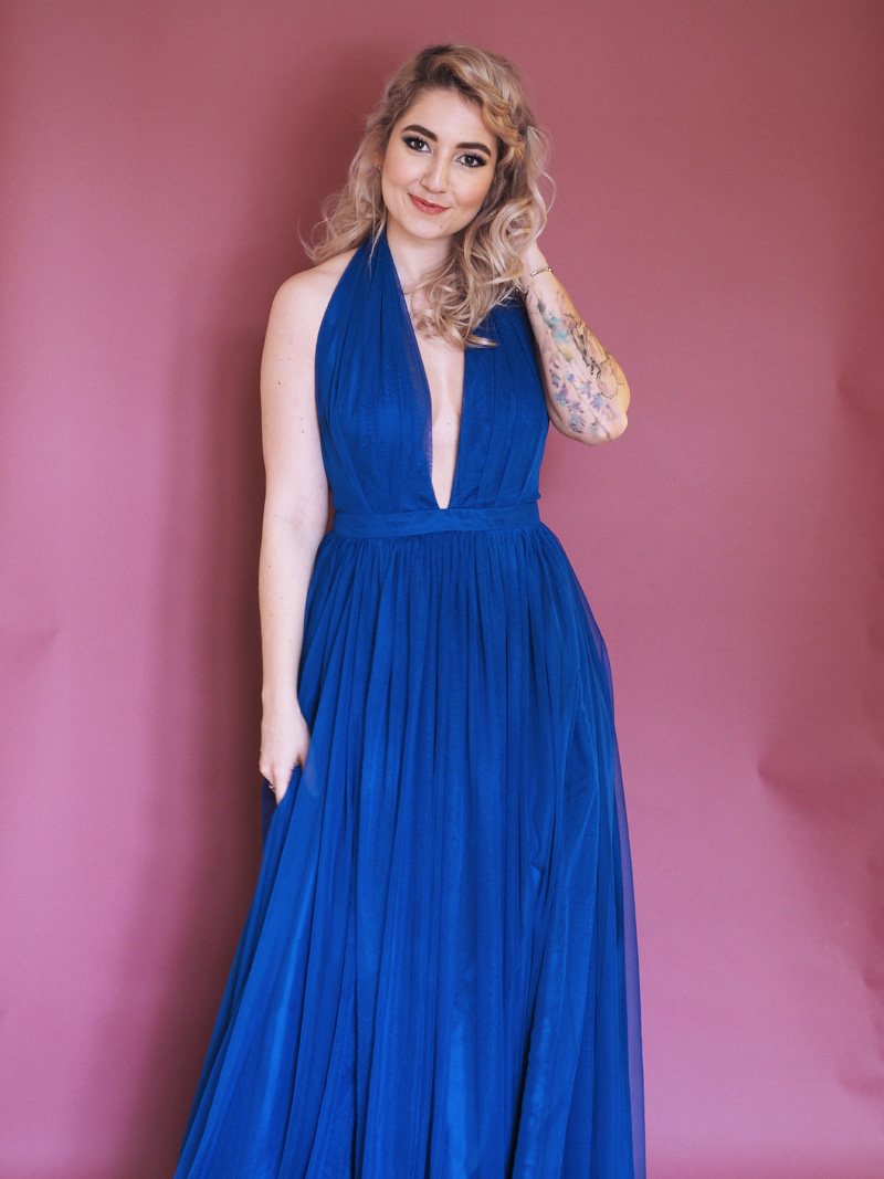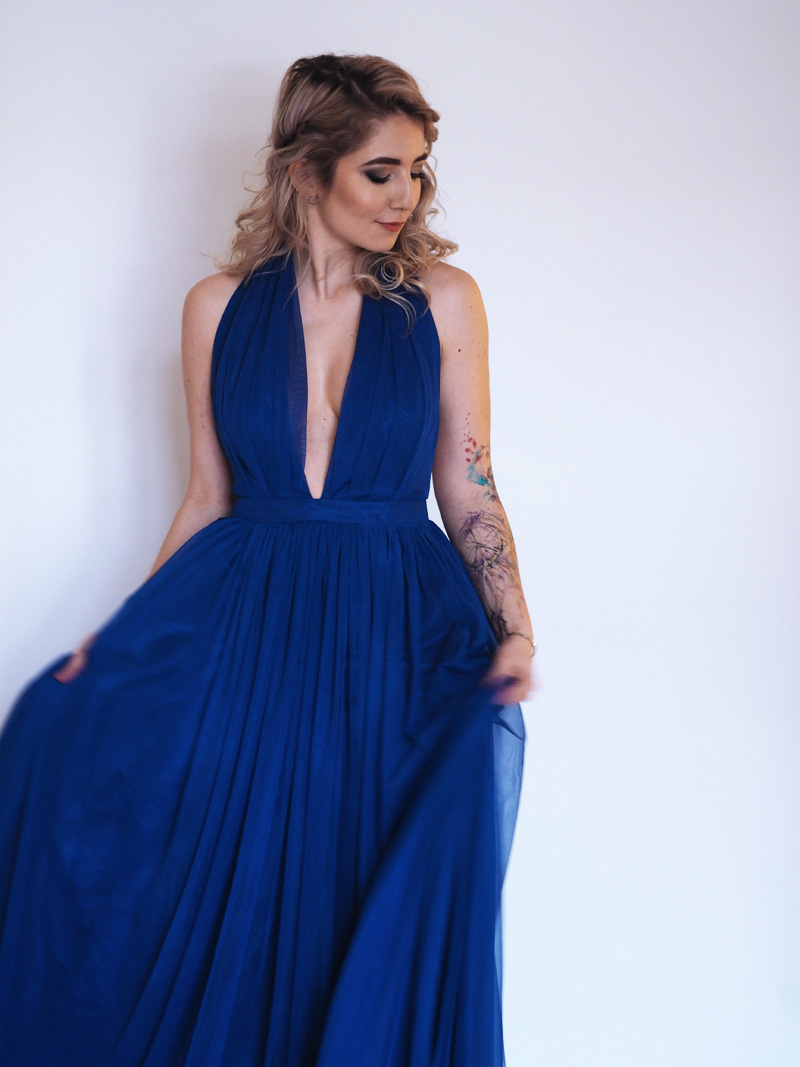 Fotky v šatech vám ale ukázat můžu, nafotili jsme je totiž s Kubou v Hubu hned po nalíčení a učesání, aby to bylo jako celek. Na instagramu vás šaty nadchly, fotky v nich jsou nejúspěšnější za poslední měsíce, jak mi aktivně hlásí statistiky, tak vám o nich chci říct trochu víc. Když mi někdy v říjnu přišla nabídka z webu Glamsy, že by mi chtěli ušít šaty na míru a pojmenovat je po mě, byla jsem lehce v šoku – příjemném samozřejmě! Příležitost byla jasná – bráchy ples – a tak jsem do toho šla. Odsouhlasila jsem střih, vybrala si barvu, poslala míry, občas si s týmem Glamsy vyměnila email a pár dní před plesem už jsem šaty obdivovala před zrcadlem. Asi vám dojde, že to nejsou šaty, ve kterých by se člověk mohl opít nebo někde hodně akčně tancovat – já jsem sice pár tanečků v diskotékovém sále zvládla, ale musela jsem si dávat dost velkej pozor, aby nevykouklo něco, co má zůstat schované. Byla jsem s nimi ale strašně spokojená, cítila jsem se v nich skvěle, vyzývavě a přesto na úrovni a stylově. No co vám budu povídat, jsem poměrně dost hrdá na to, že nesou moje