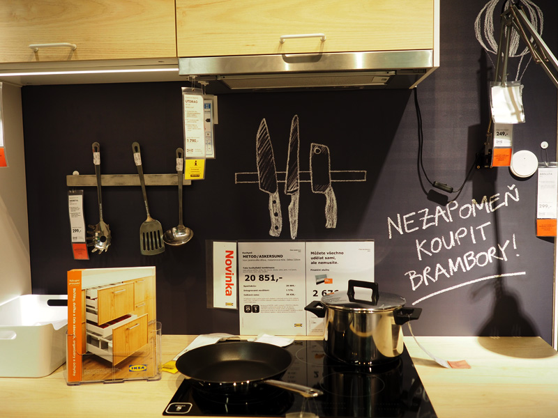 Procházíme celou Ikeu, v každým koutku trávíme hodinu, fotíme a opisujem si všechno, co jsme našli nově i to, co už jsem měli vyhlídnutý online, dohadujem se, představujem si, jak by to vypadalo a řešíme problémy, jestli je tahle cena na pracovní stůl moc vysoká nebo ne – jak má tohle člověk vědět, když tyhle věci nikdy nekupoval?! Zasekávám se v oddělení kuchyní, přestože kuchyň je to jediný, co hotový máme a Kuba mě nenápadně bere za ramena a postrkuje dál. Zdržuju, já vím.