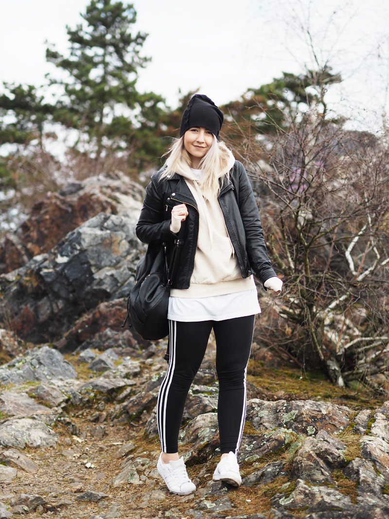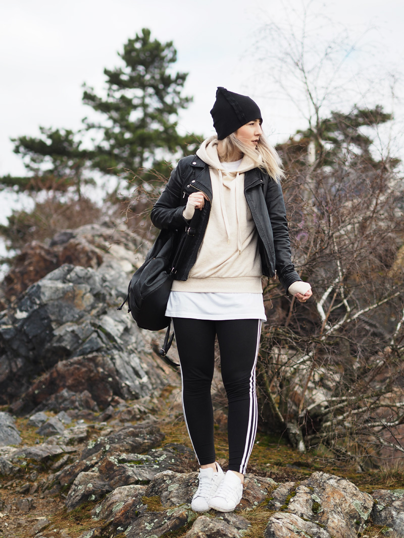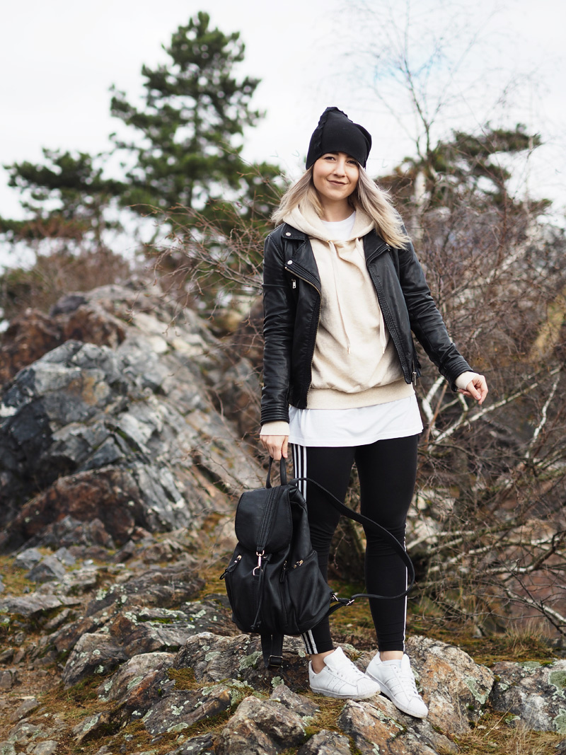 Bunda – PULL AND BEAR / triko, mikina – H&M / batoh – SINSAY / legíny, boty – ADIDAS / čepice – LUKÁŠ MACHÁČEK / rtěnka – MAC
