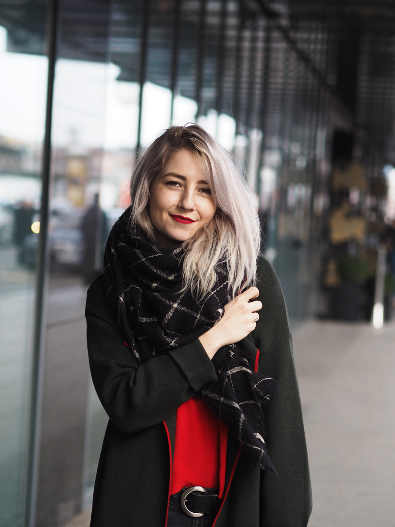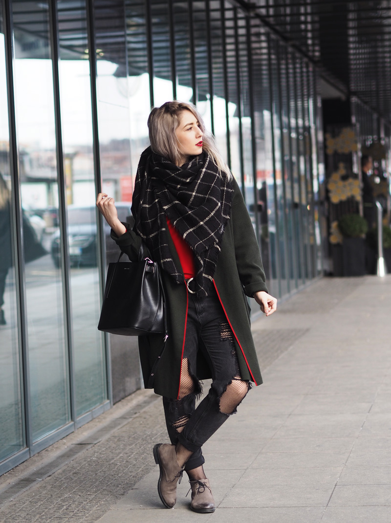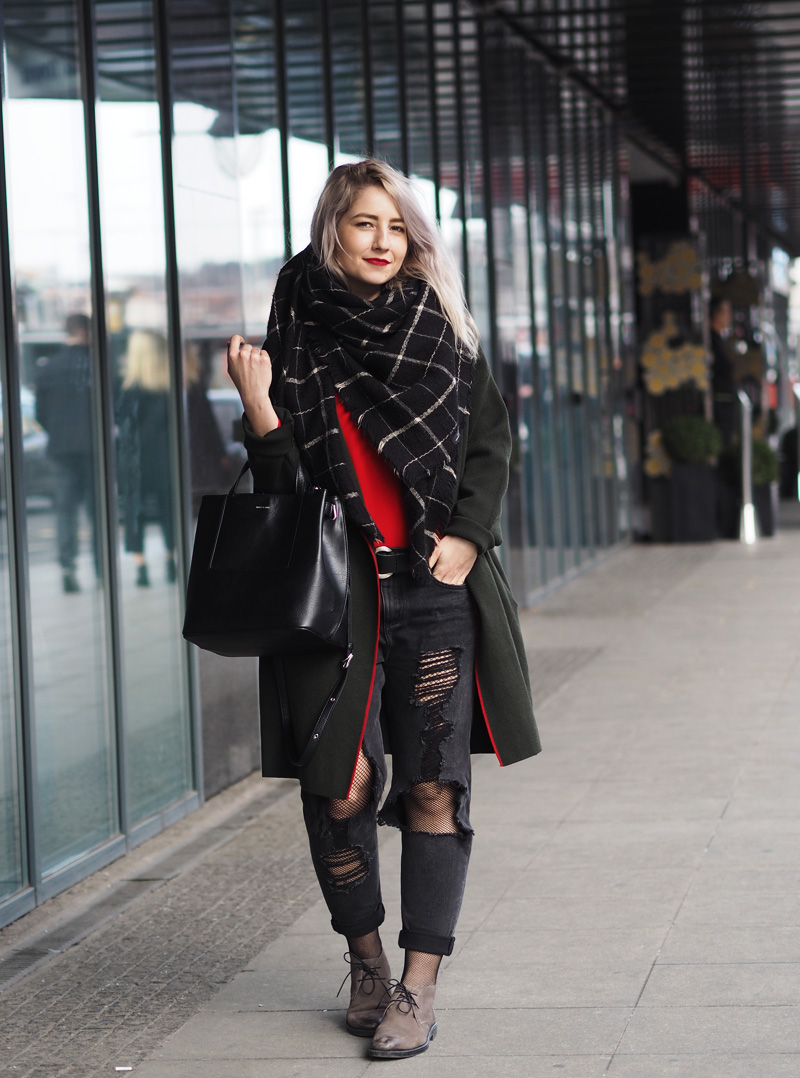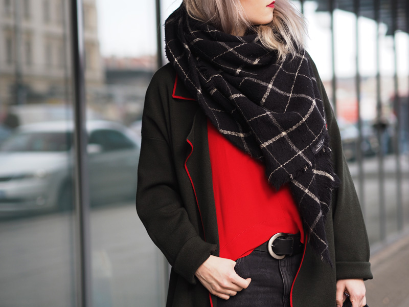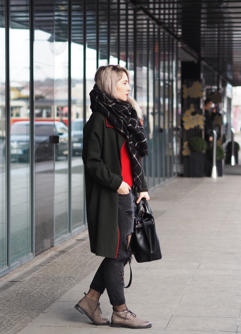 Je to totiž strašně pohodlnej oversized kus z takovýho toho pevnýho svetrovýho materiálu a já ho vytáhla hned, jakmile už nebyl potřeba fakt zimní kabát. Khaki barvu miluju a červenej detail mě fakt baví, proto jsem ho doplnila ještě červenou košilí (která je snad můj nejvýraznější kus v šatníku) a červenou rtěnkou. Síťovaný silonky v kombinaci s těmahle kalhotama budu nosit asi pořád a teplou šálu (kterou má půlka Prahy, moc skvělý žejo) asi taky ještě nějakou dobu neodložím, momentálně to vypadá, že nám Praha to hezký počasí z víkendu vrací i s úrokama.