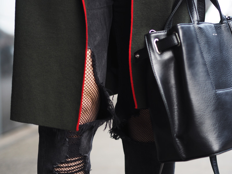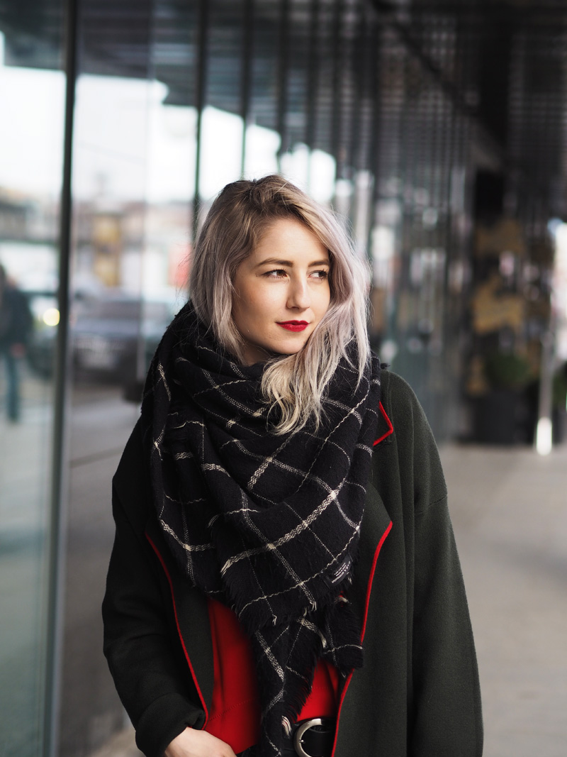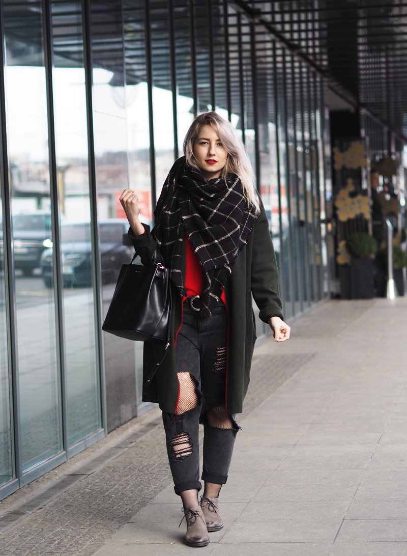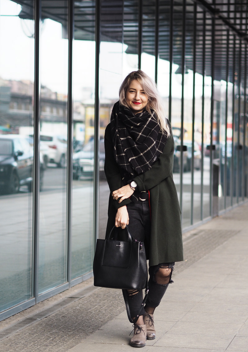 Je to totiž strašně pohodlnej oversized kus z takovýho toho pevnýho svetrovýho materiálu a já ho vytáhla hned, jakmile už nebyl potřeba fakt zimní kabát. Khaki barvu miluju a červenej detail mě fakt baví, proto jsem ho doplnila ještě červenou košilí (která je snad můj nejvýraznější kus v šatníku) a červenou rtěnkou. Síťovaný silonky v kombinaci s těmahle kalhotama budu nosit asi pořád a teplou šálu (kterou má půlka Prahy, moc skvělý žejo) asi taky ještě nějakou dobu neodložím, momentálně to vypadá, že nám Praha to hezký počasí z víkendu vrací i s úrokama.