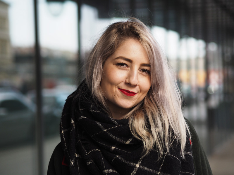 Kabát, košile, šála – ZARA / kalhoty – H&M / boty – VAGABOND / kabelka – MATT&NAT / silonky – TEZENIS / rtěnka – MAC
