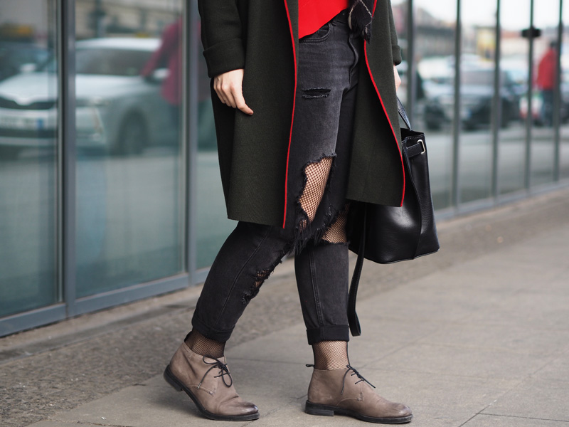 Mně se kabát líbí moc i to že má ten červený detail. Na outfitu bych vyměnila jenom kalhoty za úzký slimky nebo skinny a hlavně bez děr. Boty jsou super akorát barva by byla lepší buď černá nebo hnědá.