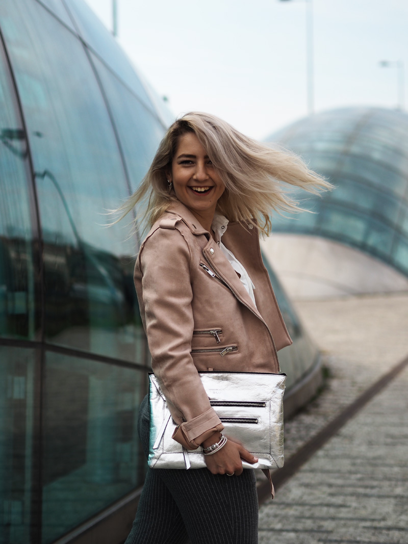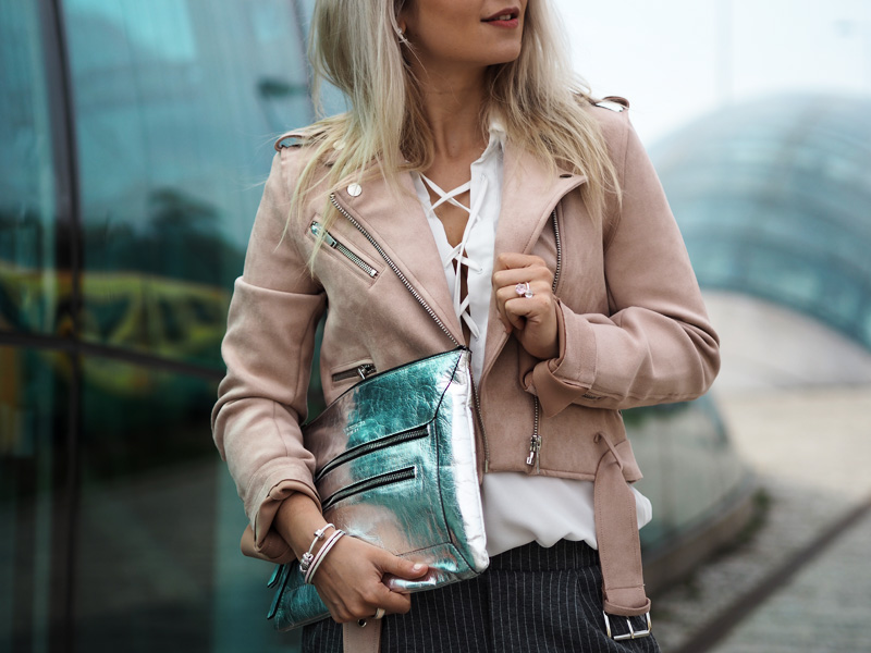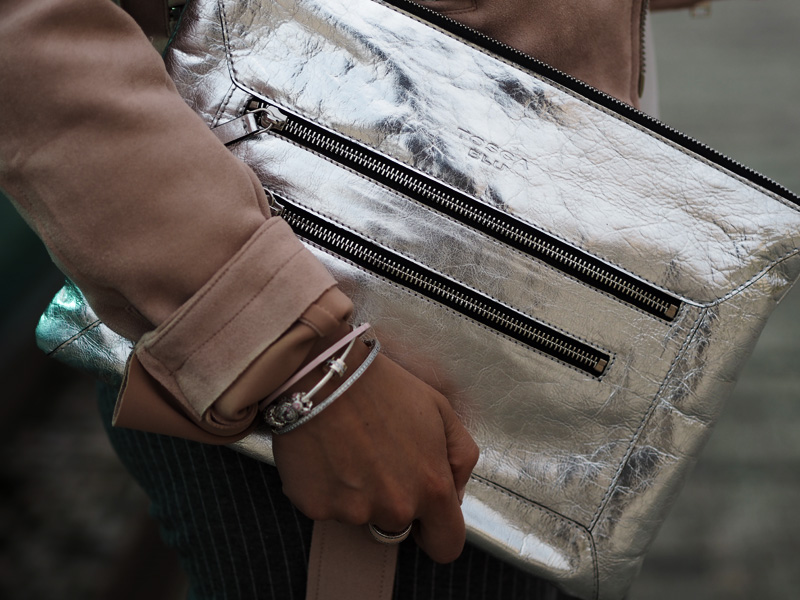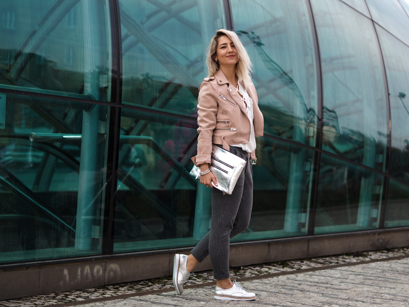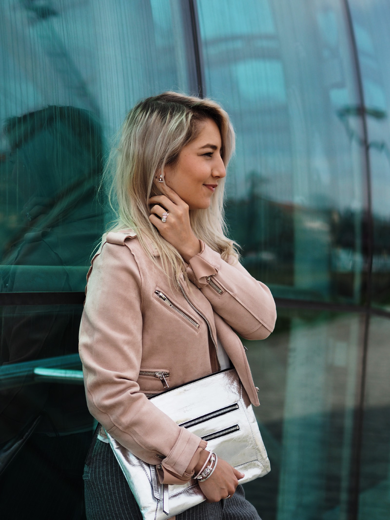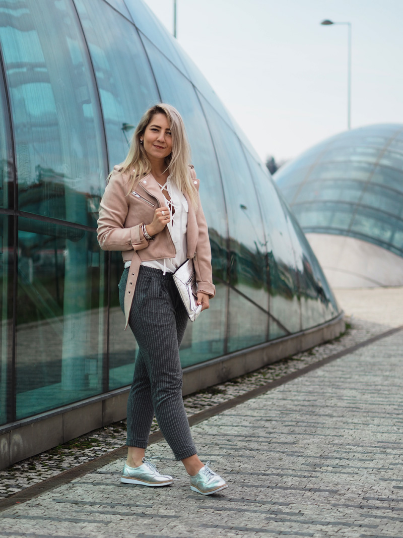 Bunda – STRADIVARIUS / kalhoty – BERSHKA / kabelka – TOSCA BLU / boty, košile – ? / náramky, prstýnky, náušnice – PANDORA