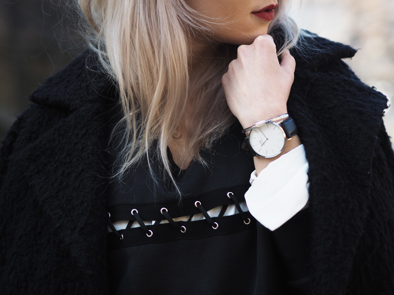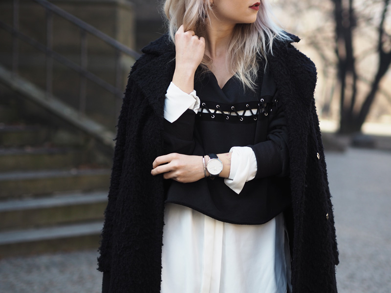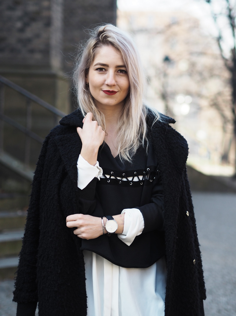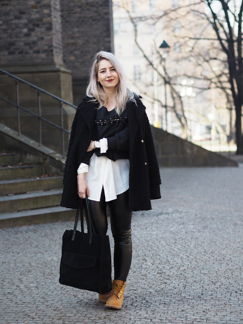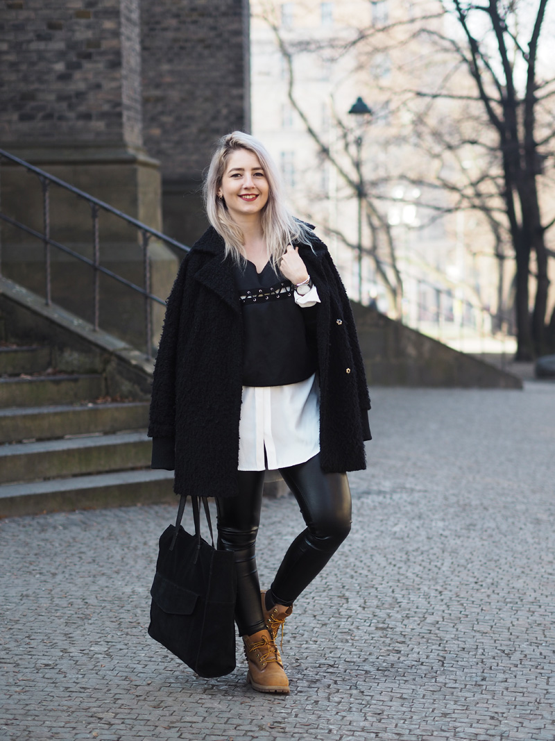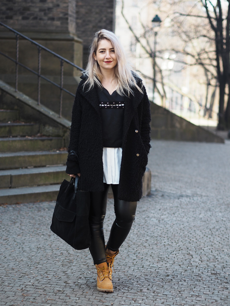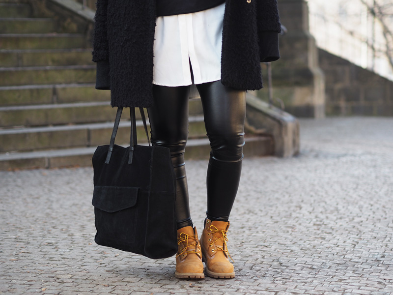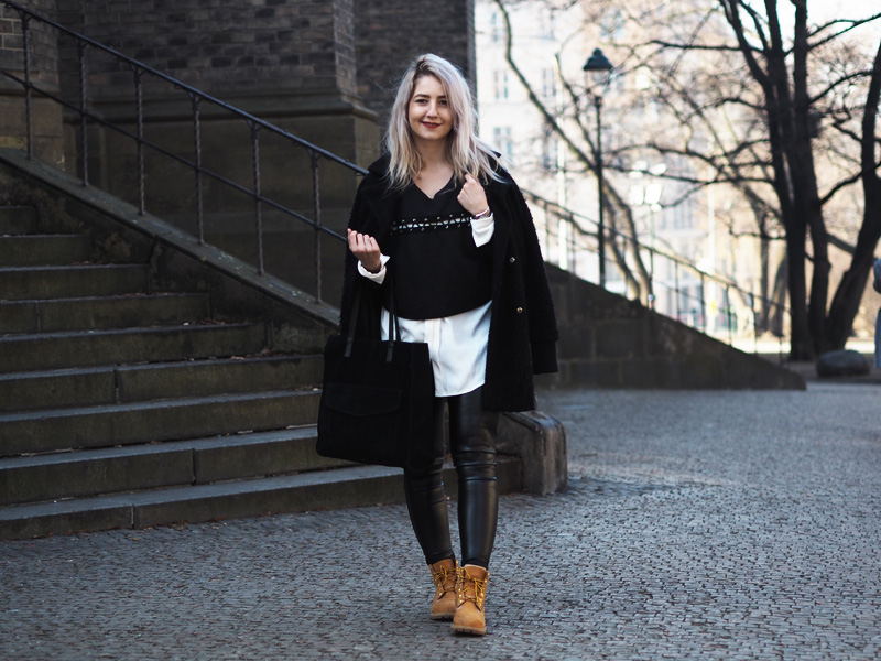Tak to vypadá, že názvy outfitových článků vzejdou poměrně často z Kubových úst. Myslím, že sami poznáte kdy tomu tak je a kdy ne :D. Tenhle outfit je doufám uplně poslední s zimním kabátem a Timberlandama, který s radostí uklidím do skříně a za 3/4 roku je zase s láskou vytáhnu, protože to byla fakt dobrá koupě! Obecně kousky z tohohle outfitu (kromě kalhot, ty jsou děsně nepohodlný :D), byly dobrý koupě! Dlouhou košili z Lindexu nosím pořád a pořád, protože to je vděčnej kousek na všechny možný kombinace, krátkou sešívanou mikinu ze Zary jsem si oblíbila hlavně díky střihu a detailům – počkejte si, až ji na jaře uvidíte v celý její kráse – koženou kabelku jsem dostala od mamky k Vánocům a kabát za dvě stovky z výprodeje v Gatu asi tři roky zpátky, nadělal taky hodně parády a stále se nerozpadá, což absolutně nechápu.