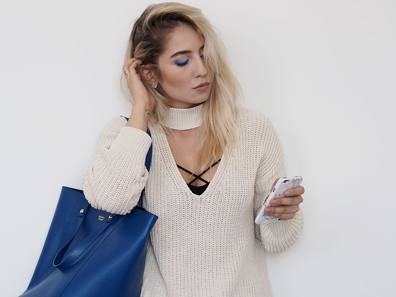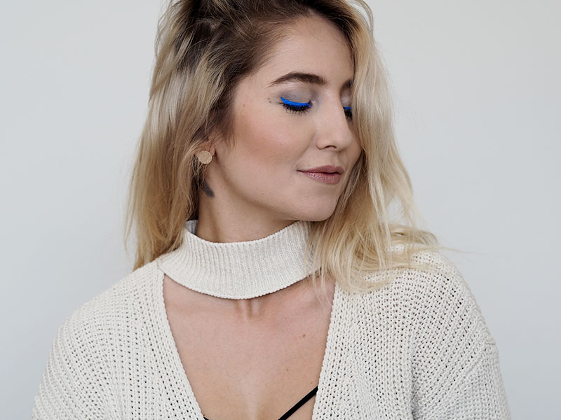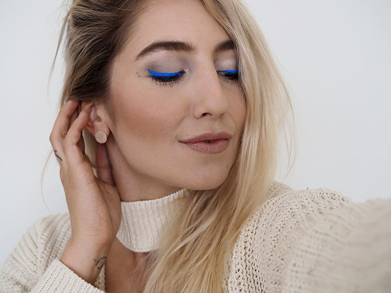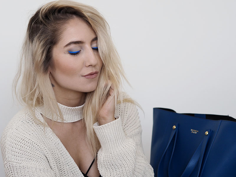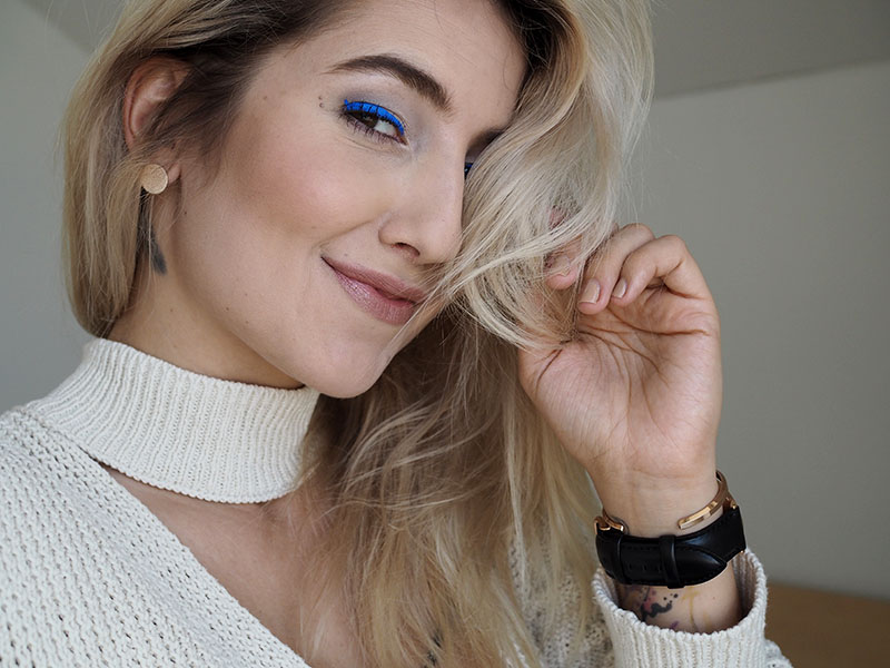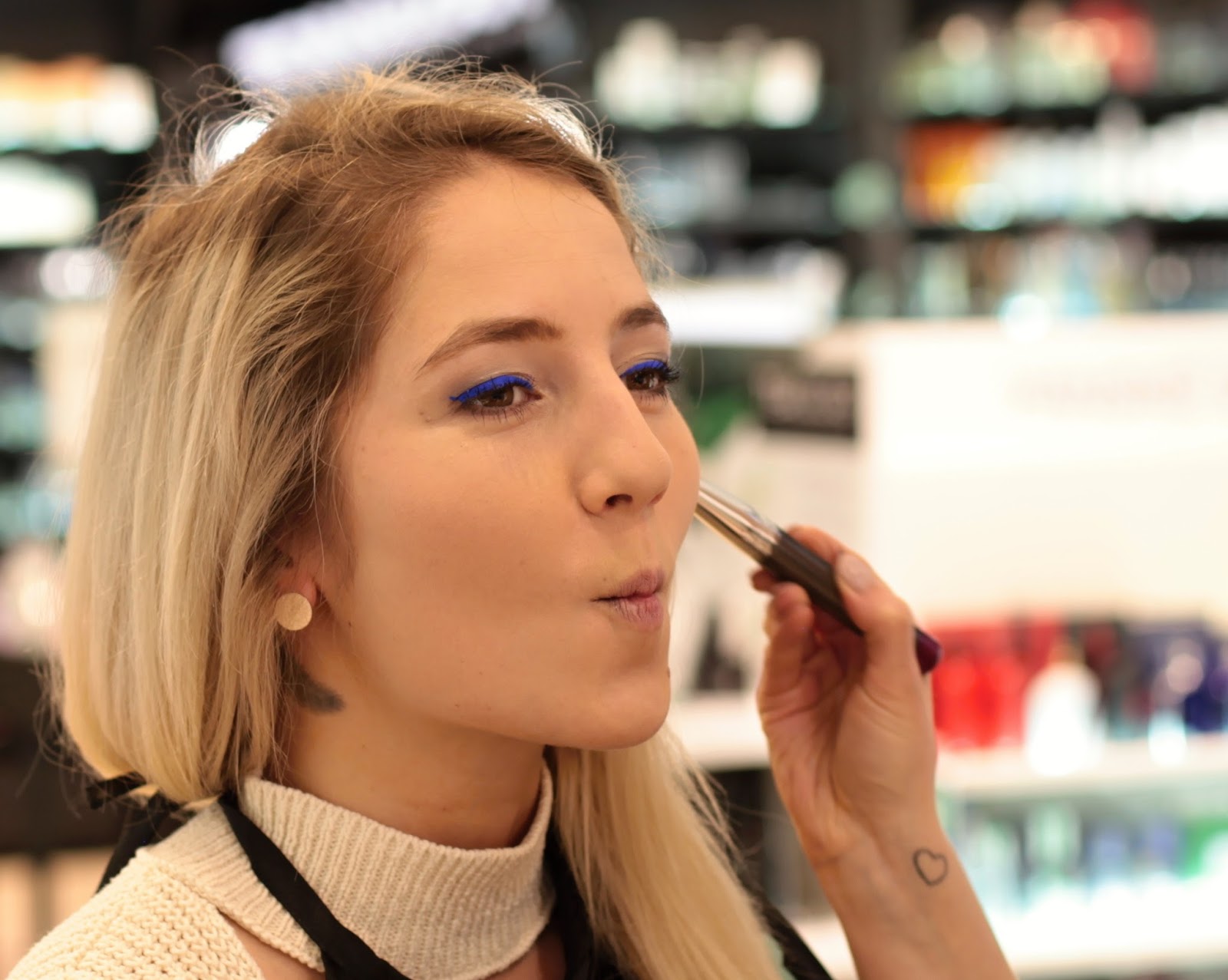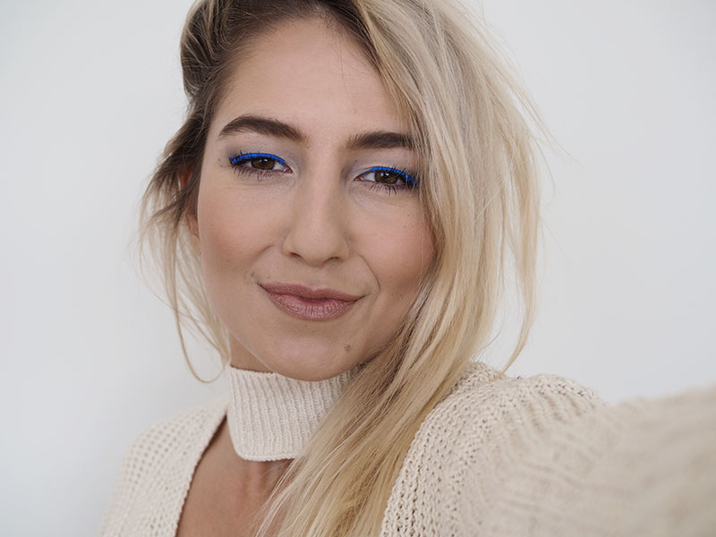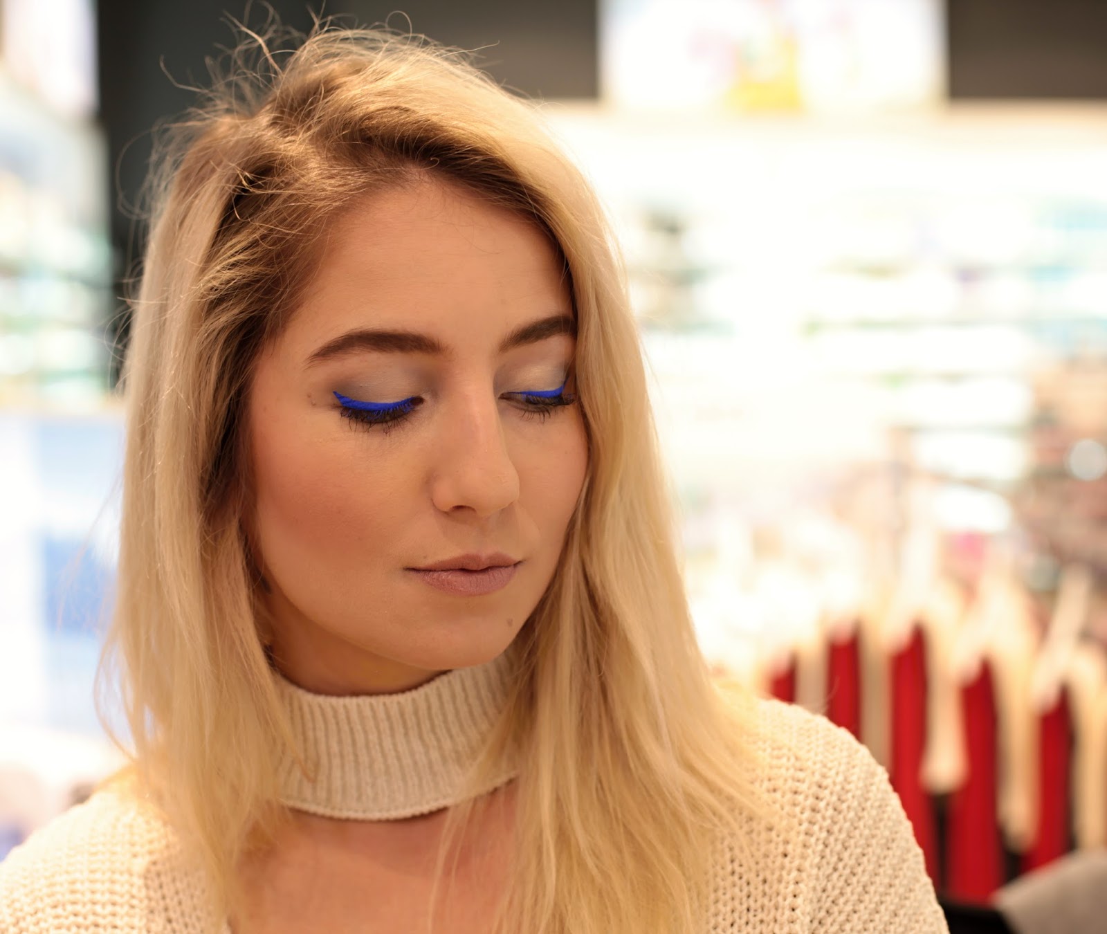 No a protože moje pleť a já celkově jsem hodně zvyklá na značky NYX a The Balm, které jsou pod Douglasem také exkluzivně, ukecala jsem Lucku, aby využila i ty, protože se v nich cítím parádně. Původně bylo v plánu klasický výrazný kouřový líčení, který dělá Lucka ráda a který už jsem od ní měla několikrát, ale napadlo mě, že bychom mohli zkusit něco víc ujetýho a vzhledem k mýmu outfitu, složenýho z béžovýho svetru a výrazný modrý kabelky, padla volba na béžový stíny s netradiční modrou linkou. Ukázalo se to jako skvělá volba a uplně každej mi to v Douglasu pochválil. Tak mrkejte, jak to vznikalo!