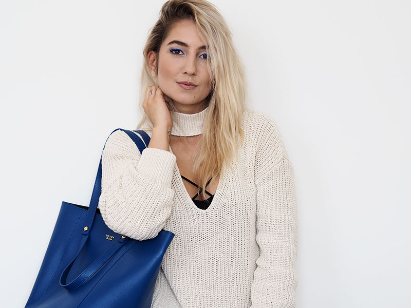 No a protože moje pleť a já celkově jsem hodně zvyklá na značky NYX a The Balm, které jsou pod Douglasem také exkluzivně, ukecala jsem Lucku, aby využila i ty, protože se v nich cítím parádně. Původně bylo v plánu klasický výrazný kouřový líčení, který dělá Lucka ráda a který už jsem od ní měla několikrát, ale napadlo mě, že bychom mohli zkusit něco víc ujetýho a vzhledem k mýmu outfitu, složenýho z béžovýho svetru a výrazný modrý kabelky, padla volba na béžový stíny s netradiční modrou linkou. Ukázalo se to jako skvělá volba a uplně každej mi to v Douglasu pochválil. Tak mrkejte, jak to vznikalo!