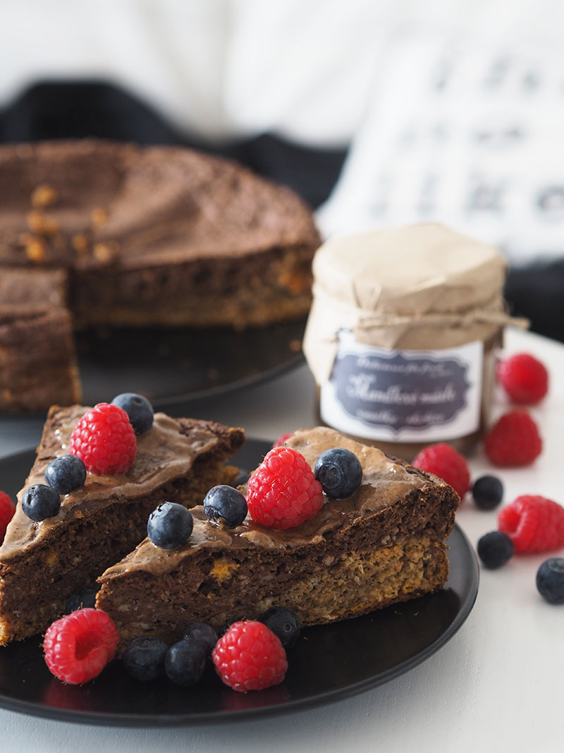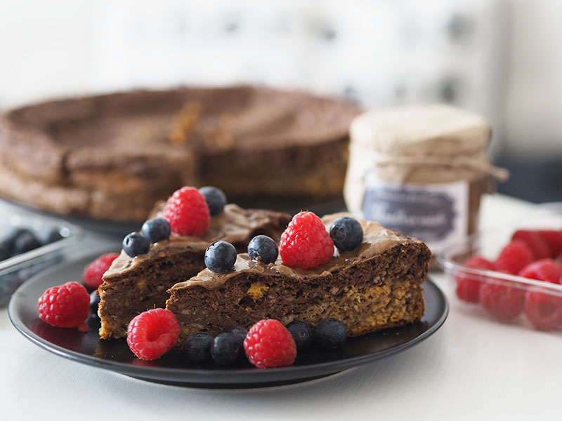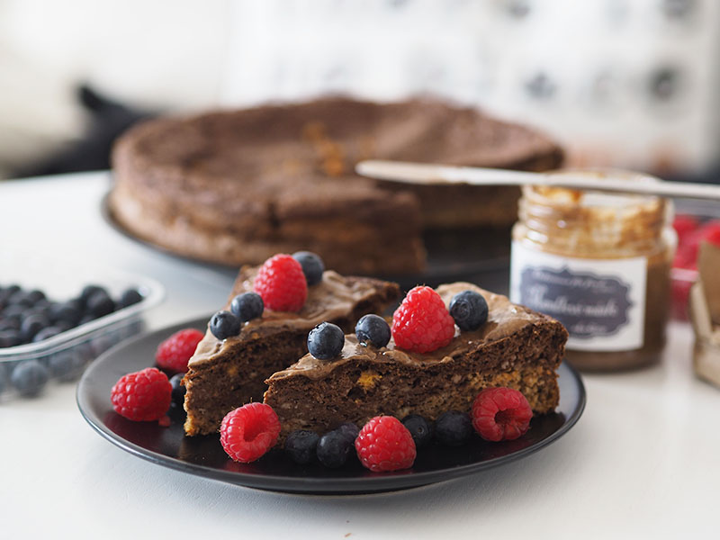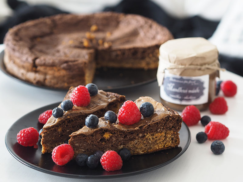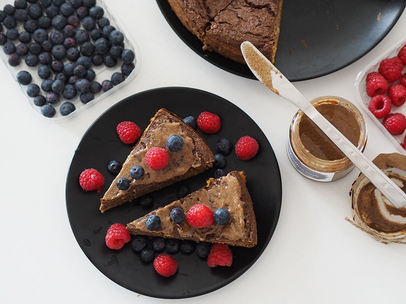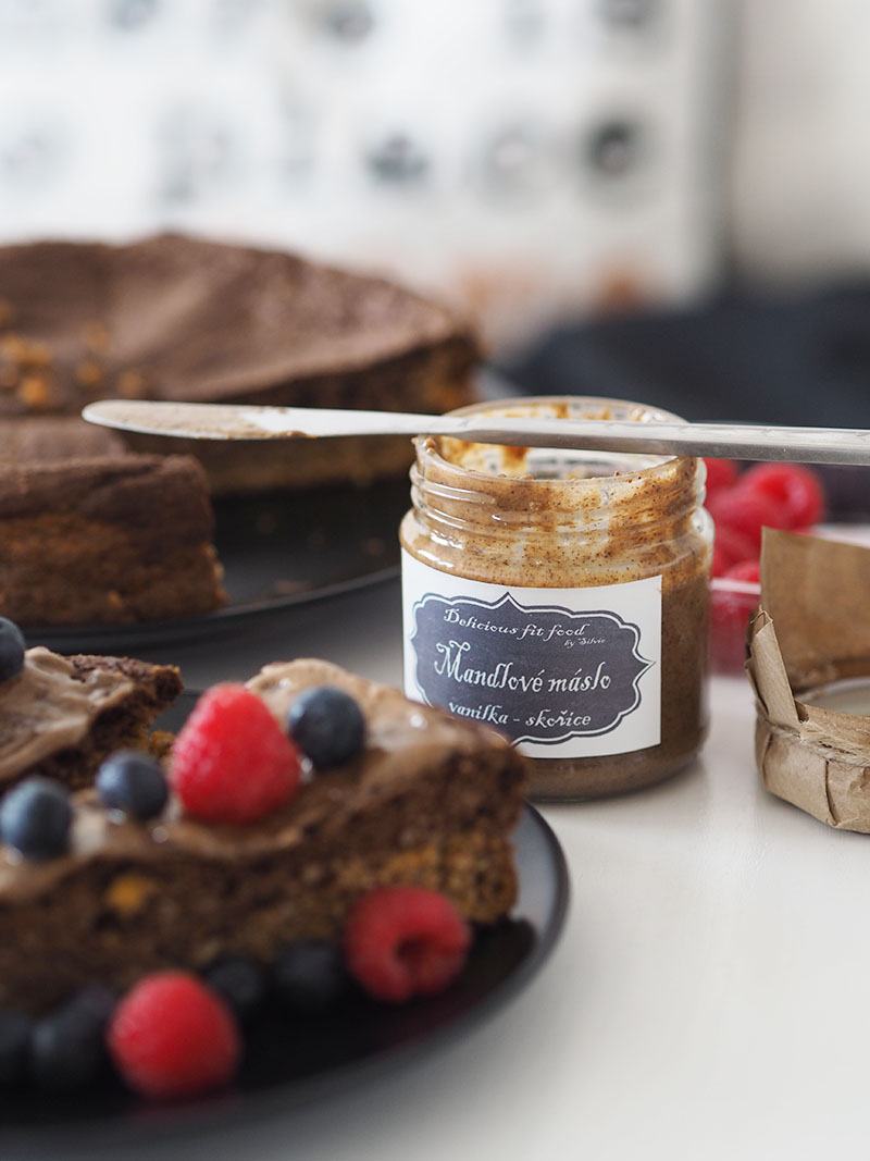 Před podáváním libovolně dozdobíme. Já potírám ořechovým máslem a přidávám ovoce. Super variantou je ale třeba jogurt, javorovej sirup nebo cokoliv jinýho, co máte rádi. Dort je vláčnej a chuťově jemnej, takže se nebude tlouct snad s ničím.