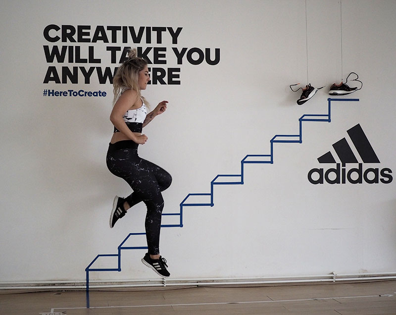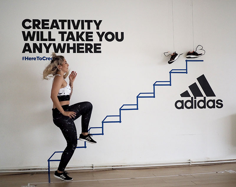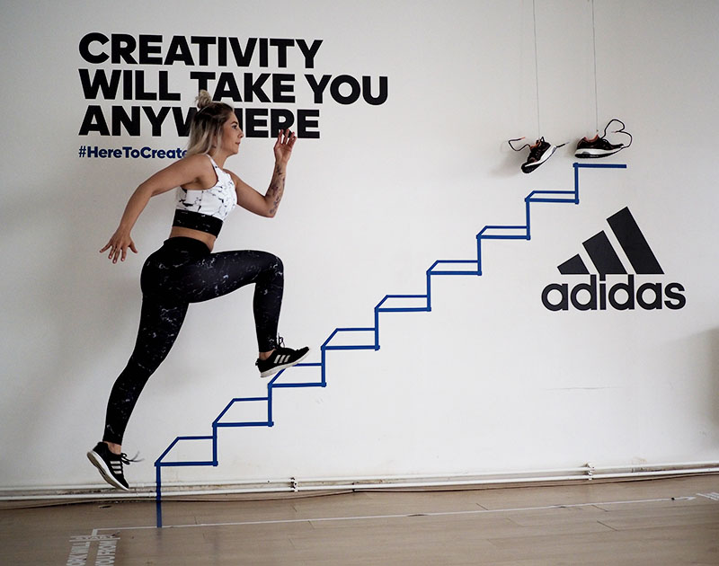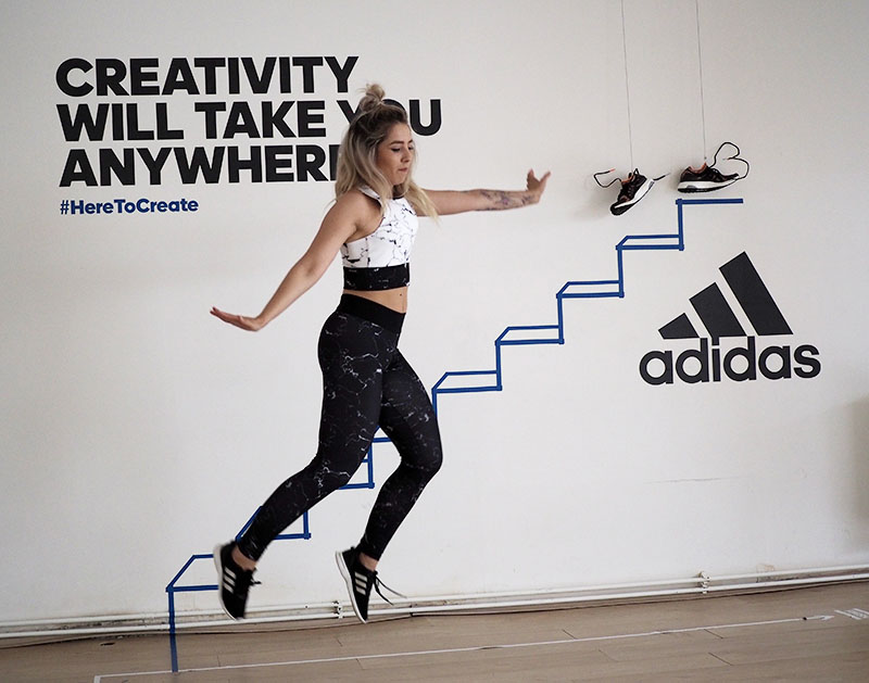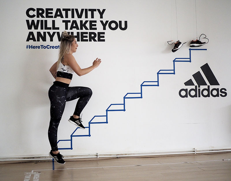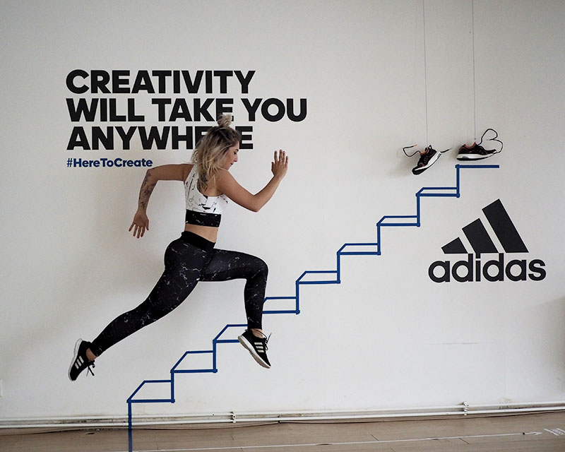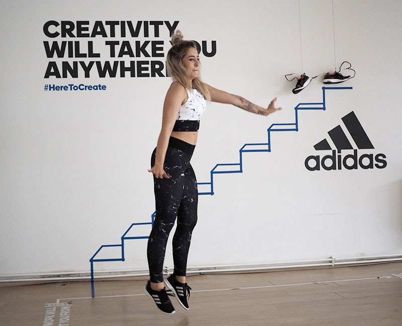 Už jen domluvit tohle focení a sladit tak časy dvou pracujících lidí a pár minut volnýho sálu ve fitku, kde je normálně lekce za lekcí byl dost náročnej úkol. Nejlehčí bylo vybrat outfit. Mramorový kombo jsem vám totiž už musela ukázat a nejradši bych nenosila nic jinýho. Nevěděla jsem ani, jaká instalace tam je a proto bylo i logický se sladit do černobíla. Instalace v sále mě každopádně nadchla na první pohled a první co mě napadlo bylo, že to vyfotíme tak jakože vybíhám schody. To přece nebude tak těžký, stačí vyskočit a Kuba trefí ten správnej moment, kdy budu mít nohu vy výšce schodu. Hahahaha, TO JO! Po stopadesáti skocích, kdy jsem byla splavená jak po šíleným kardiu a stále bez jediný povedený fotky jsem začínala být trochu v depresi. Většinou jsem skákala jak jelen, na schod jsem se zásadně netrefila a druhou nohu jsem měla vystřelenou tak vysoko, že kdybych takhle někdy fakt běžela do schodů, tak se slušně rozbiju. Asi zvyk z krasobruslení, jehož pózy jsem nakonec taky využila, protože i to vypadá dost dobře. Ale k těm schodům se nejvíc hodil běh, tak jsme bojovali tak dlouho, dokud jedna fotka nevyšla. Naivně jsem si myslela, že se budu tvářit dobře, ale po všech těch marných pokusech jsem mávla rukou nad výrazem a šlo hlavně o pointu. No, pojďte se radši zasmát těm extra vydařeným.