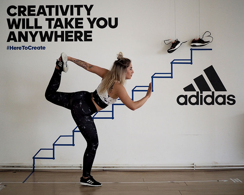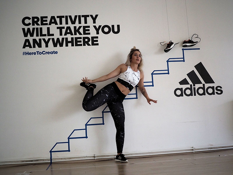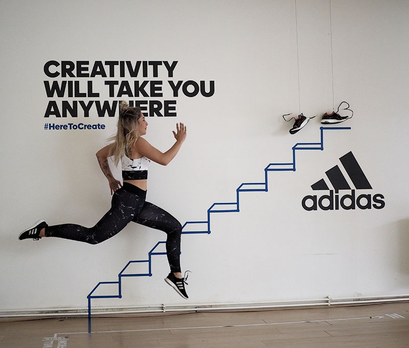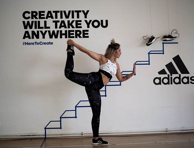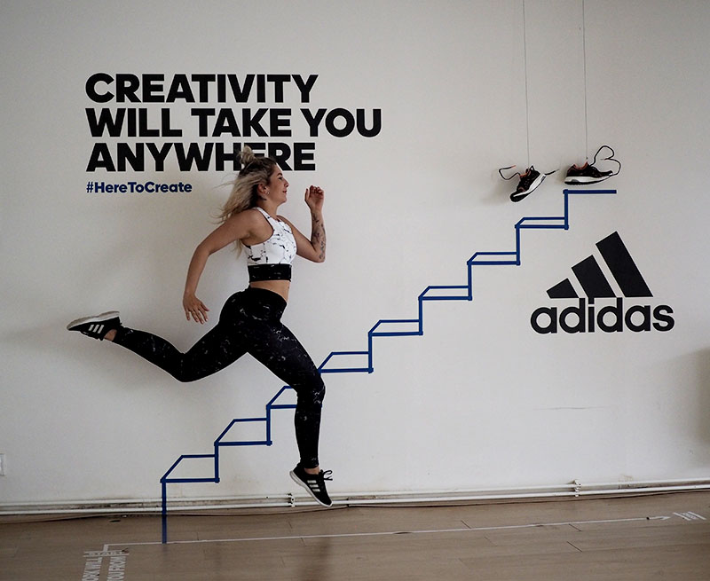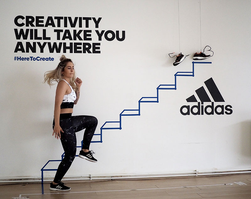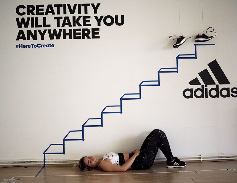 Už jen domluvit tohle focení a sladit tak časy dvou pracujících lidí a pár minut volnýho sálu ve fitku, kde je normálně lekce za lekcí byl dost náročnej úkol. Nejlehčí bylo vybrat outfit. Mramorový kombo jsem vám totiž už musela ukázat a nejradši bych nenosila nic jinýho. Nevěděla jsem ani, jaká instalace tam je a proto bylo i logický se sladit do černobíla. Instalace v sále mě každopádně nadchla na první pohled a první co mě napadlo bylo, že to vyfotíme tak jakože vybíhám schody. To přece nebude tak těžký, stačí vyskočit a Kuba trefí ten správnej moment, kdy budu mít nohu vy výšce schodu. Hahahaha, TO JO! Po stopadesáti skocích, kdy jsem byla splavená jak po šíleným kardiu a stále bez jediný povedený fotky jsem začínala být trochu v depresi. Většinou jsem skákala jak jelen, na schod jsem se zásadně netrefila a druhou nohu jsem měla vystřelenou tak vysoko, že kdybych takhle někdy fakt běžela do schodů, tak se slušně rozbiju. Asi zvyk z krasobruslení, jehož pózy jsem nakonec taky využila, protože i to vypadá dost dobře. Ale k těm schodům se nejvíc hodil běh, tak jsme bojovali tak dlouho, dokud jedna fotka nevyšla. Naivně jsem si myslela, že se budu tvářit dobře, ale po všech těch marných pokusech jsem mávla rukou nad výrazem a šlo hlavně o pointu. No, pojďte se radši zasmát těm extra vydařeným.