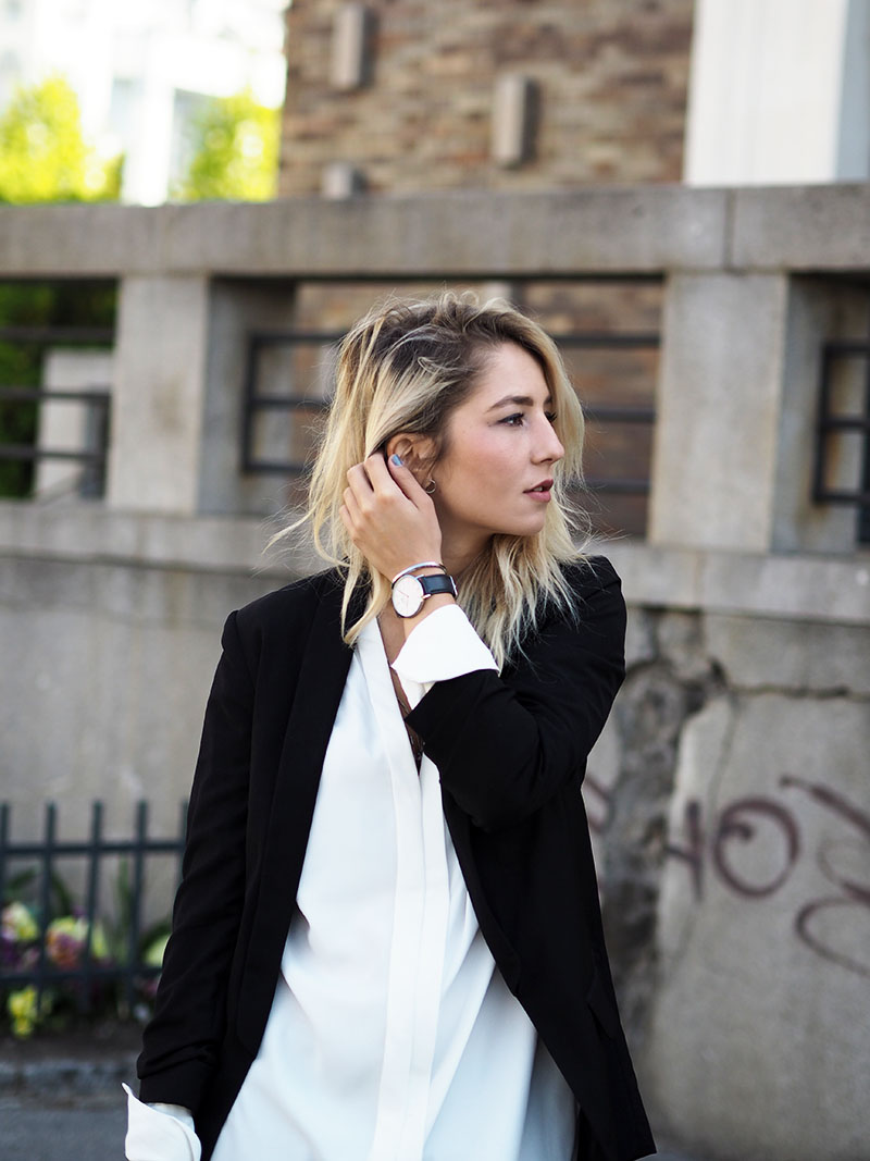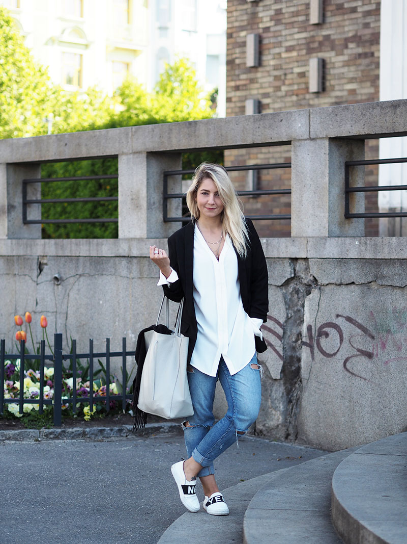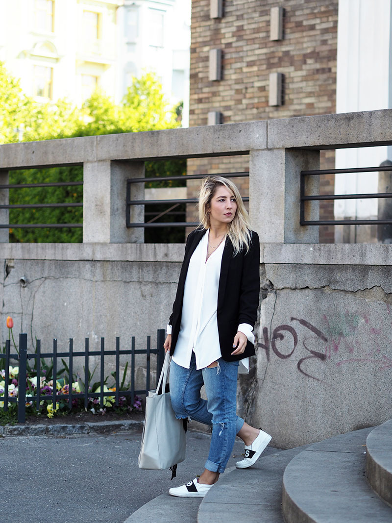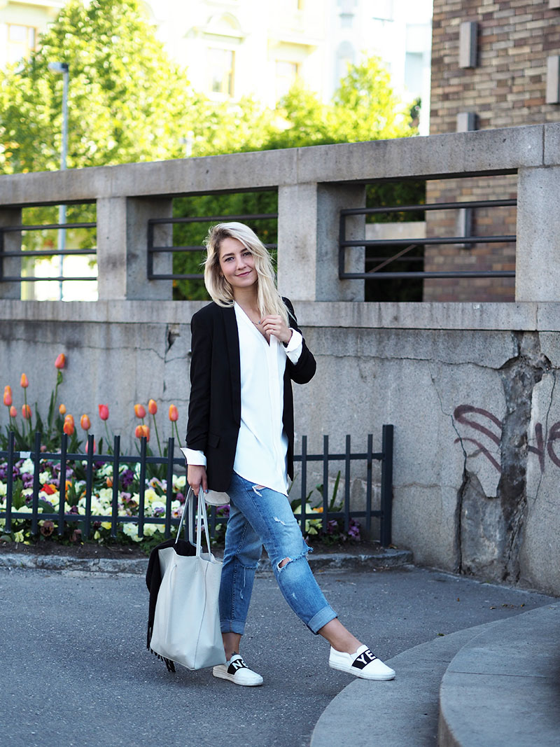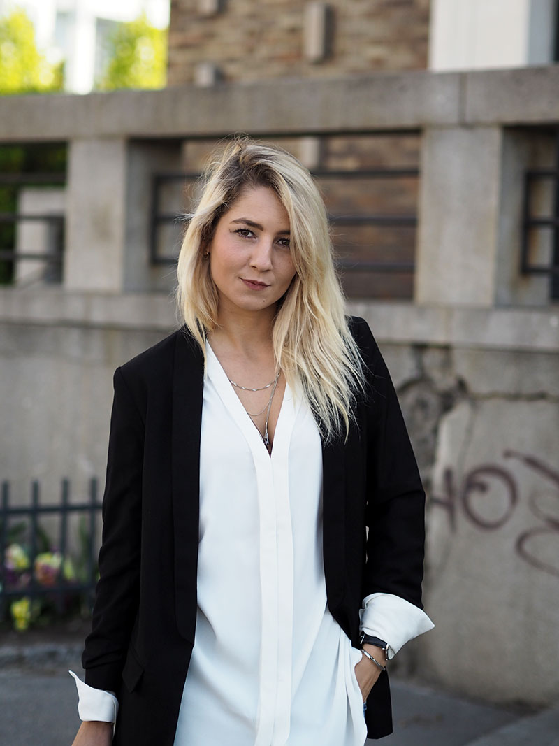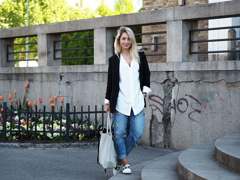 VymazatDomi, tento outfit je pre mna uplne dokonaly!! ? Ta bielo-cierna kombinacia vsetkeho spolu s tym modrim laid back denimom je skvela! Tiez ti tu strasne pristanu tie blond vlasy. 🙂 A to sako s koselou uplne milujem!