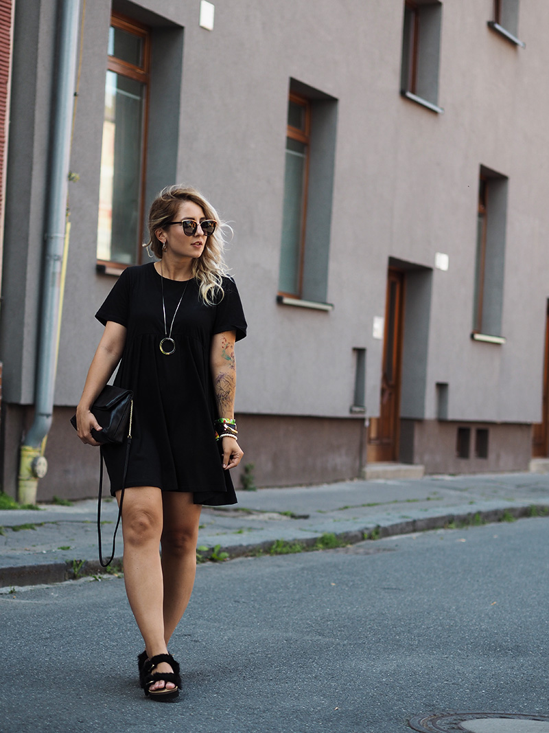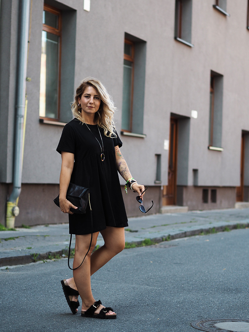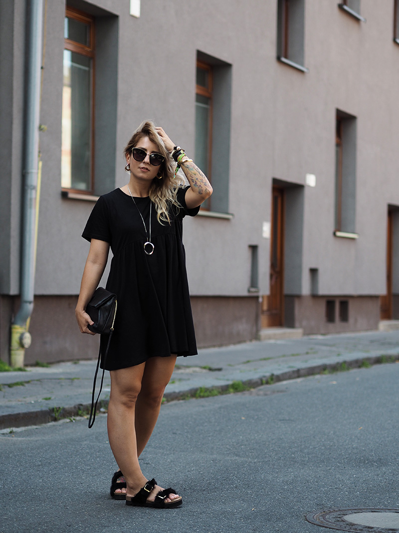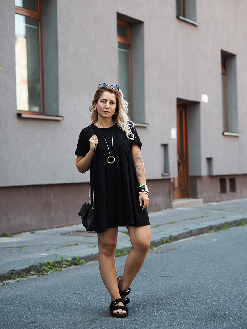 Ještě než se vám ohlásím s čerstvými dojmy z Colours, jsem tu s outfitem, ve kterým jsem do Ostravy přijela. Den předtím jsem si totiž na Answearu pořídila svoje vytoužený chlupatý pantofle a věděla jsem, že je doma nechat nemůžu. A tak jsem natáhla nejpohodlnější volný černý šaty a doladila to pár zlatýma doplňkama. Vlak nám sice jel už před osmou ráno, ale já jsem samým natěšením nemohla dospat, tak jsem si stihla i navlnit vlasy a poprvý se v nich vyfotit, docela jsem si teď na tenhle “účes” zvykla, vyhovuje mi, že to udělá objem a já nemám takovou potřebu si pořád sahat do vlasů a čechrat je. V Ostravě jsem počítala s nafocením outfitu, než se převlíknu a vyrazíme do areálu, ale nepodařilo se nám najít žádnou hezkou ulici a tohle bylo nejmenší zlo, tak snad to u vás projde! 😀