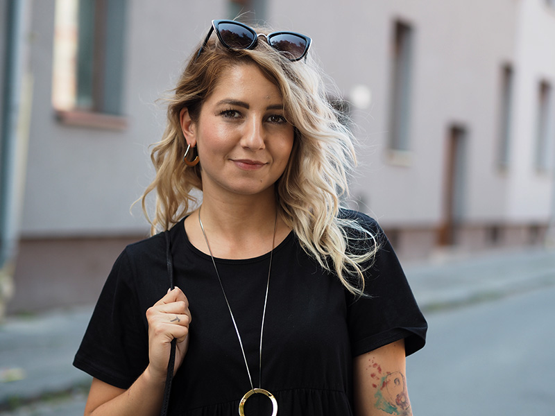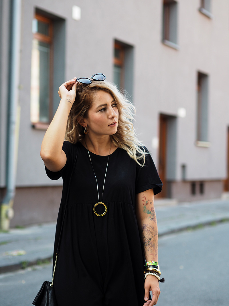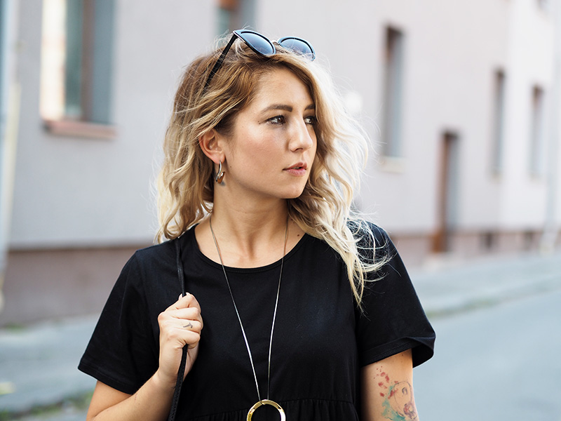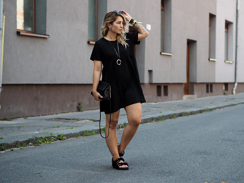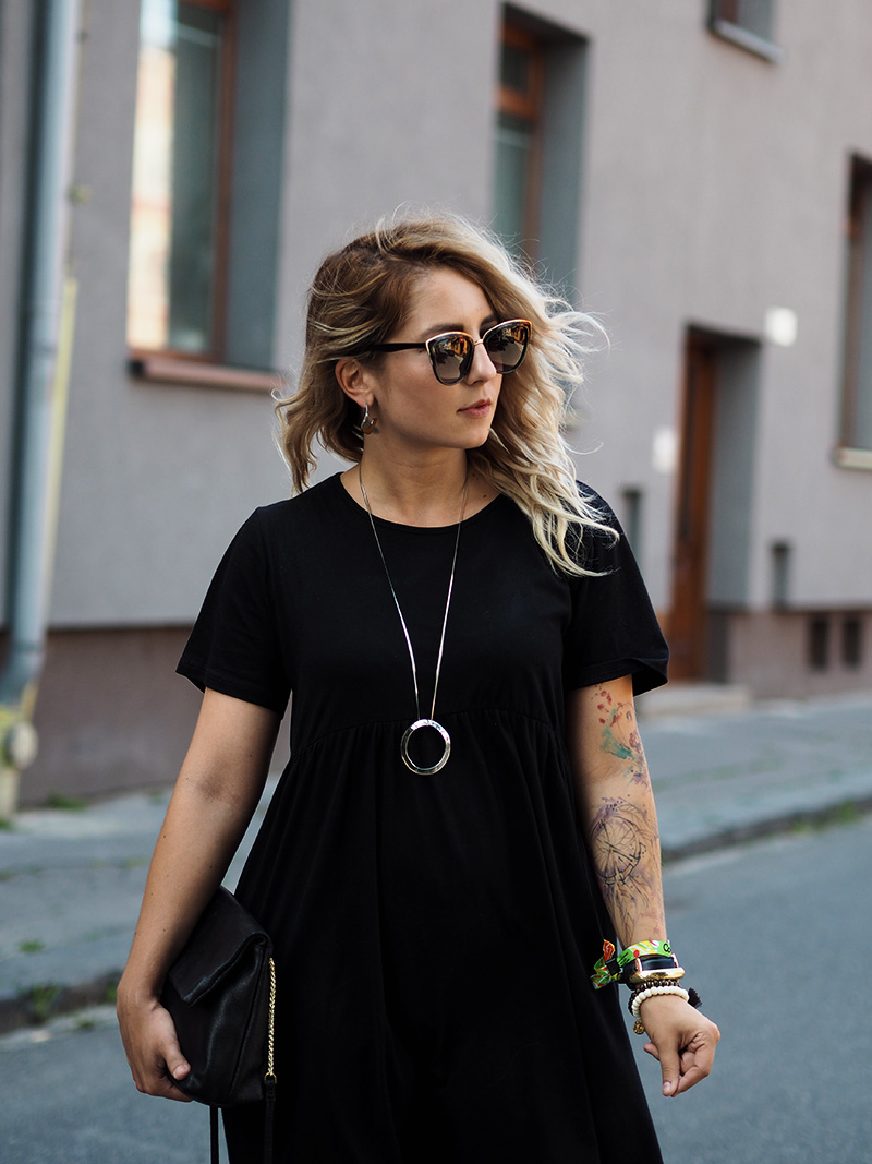 Ještě než se vám ohlásím s čerstvými dojmy z Colours, jsem tu s outfitem, ve kterým jsem do Ostravy přijela. Den předtím jsem si totiž na Answearu pořídila svoje vytoužený chlupatý pantofle a věděla jsem, že je doma nechat nemůžu. A tak jsem natáhla nejpohodlnější volný černý šaty a doladila to pár zlatýma doplňkama. Vlak nám sice jel už před osmou ráno, ale já jsem samým natěšením nemohla dospat, tak jsem si stihla i navlnit vlasy a poprvý se v nich vyfotit, docela jsem si teď na tenhle “účes” zvykla, vyhovuje mi, že to udělá objem a já nemám takovou potřebu si pořád sahat do vlasů a čechrat je. V Ostravě jsem počítala s nafocením outfitu, než se převlíknu a vyrazíme do areálu, ale nepodařilo se nám najít žádnou hezkou ulici a tohle bylo nejmenší zlo, tak snad to u vás projde! 😀