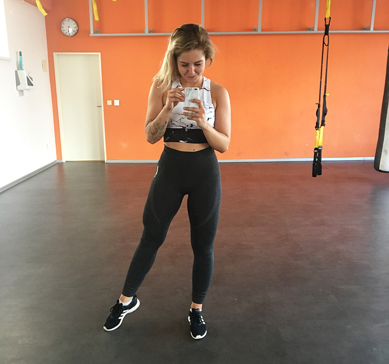 A z fitka. A pořád v těch stejných legínách, jiný teď nějak nenosím, Gymshark je láska.