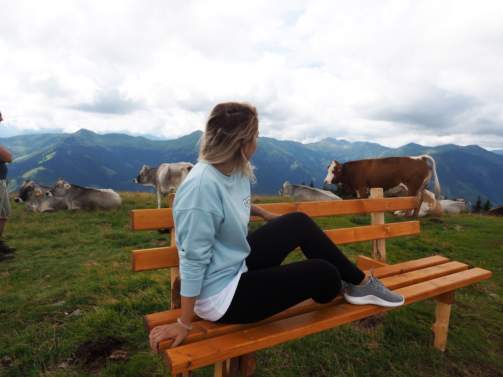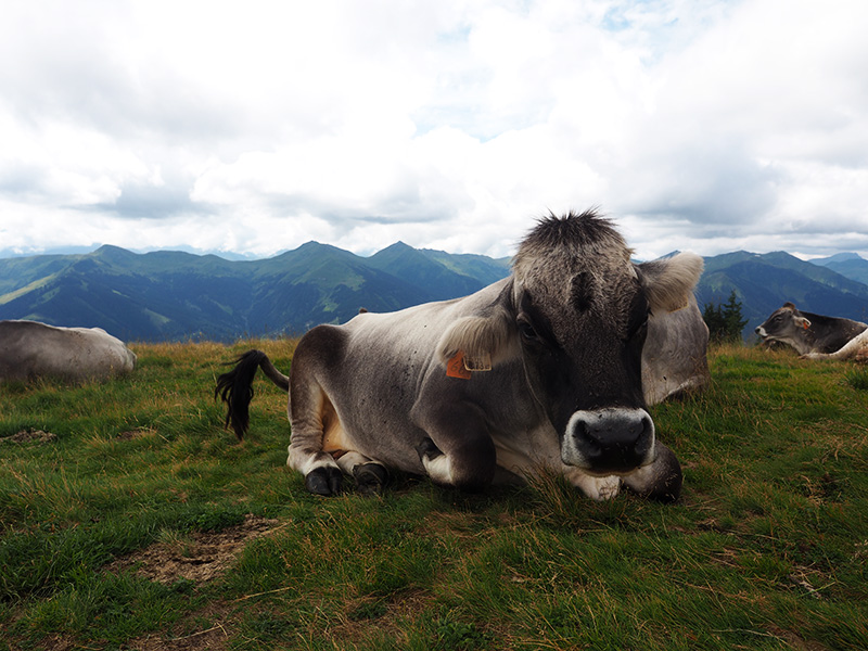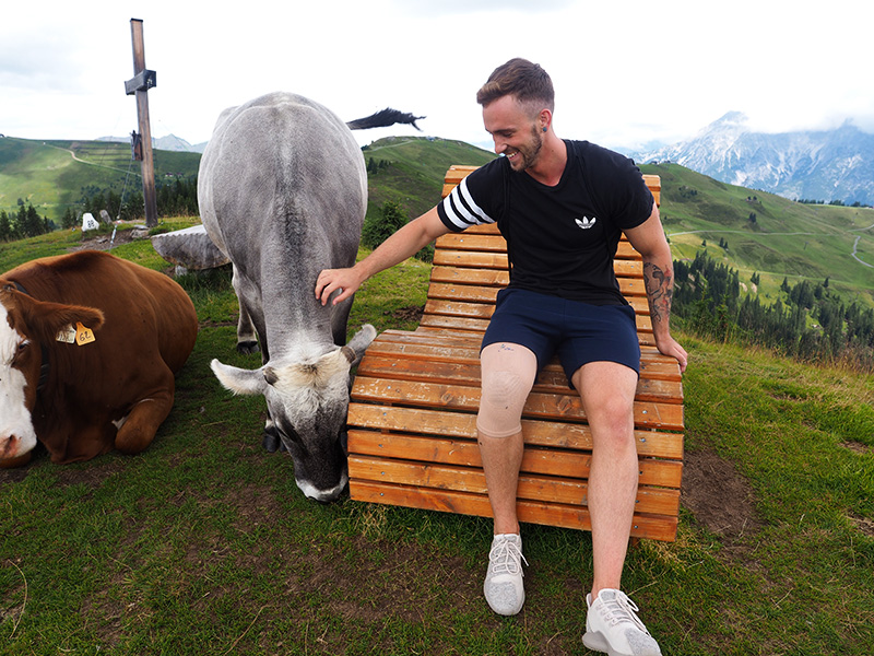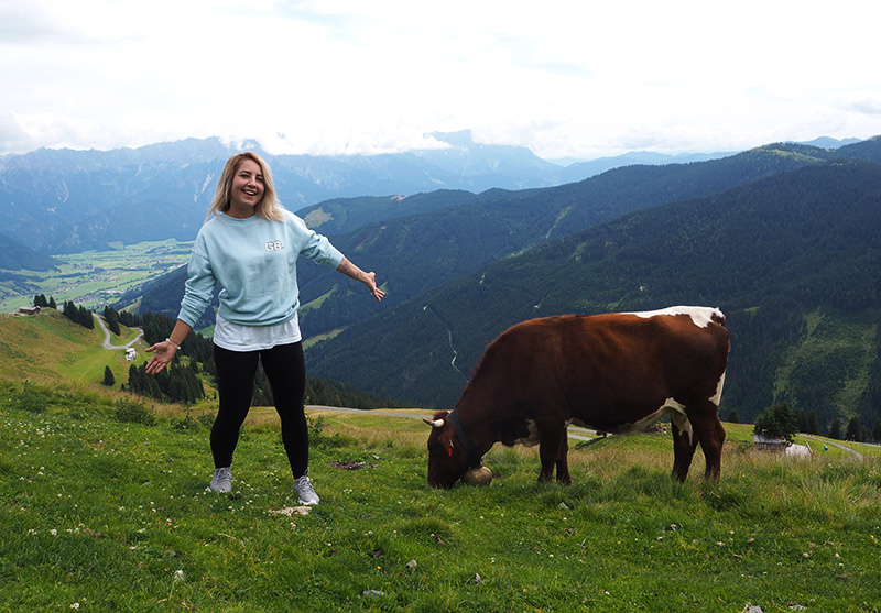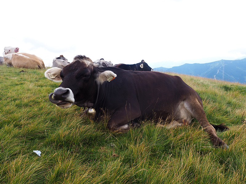 Další dny nám mělo pršet, ale protože nás probudilo sluníčko, neváhali jsme a hned po pořádný snídani vyrazili lanovkou nahoru. Mně to přišlo strašně divný – jet lanovkou v normálním oblečení a bez lyží :D. Nahoře se mi ale od první chvíle tajil dech a docela jsem chápala, co na tomhle všichni mají, ty výhledy jsou dechberoucí a bonusem jsou všudypřítomný krávy.