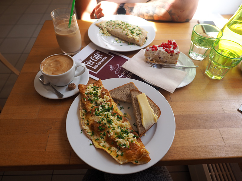 Jedná se o bio kavárnu, co používá pouze kvalitní lokální suroviny a přesně podle toho to taky chutná. Já jsem třeba v životě neměla lepší omeletu. Kuba si dal slanou palačinku plněnou pečenou zeleninou a do kafe měli mandlový mlíko – a to fakt mandlový, ne žádný Alpro. Bylo to skvělý, skvělý a ještě jednou skvělý.