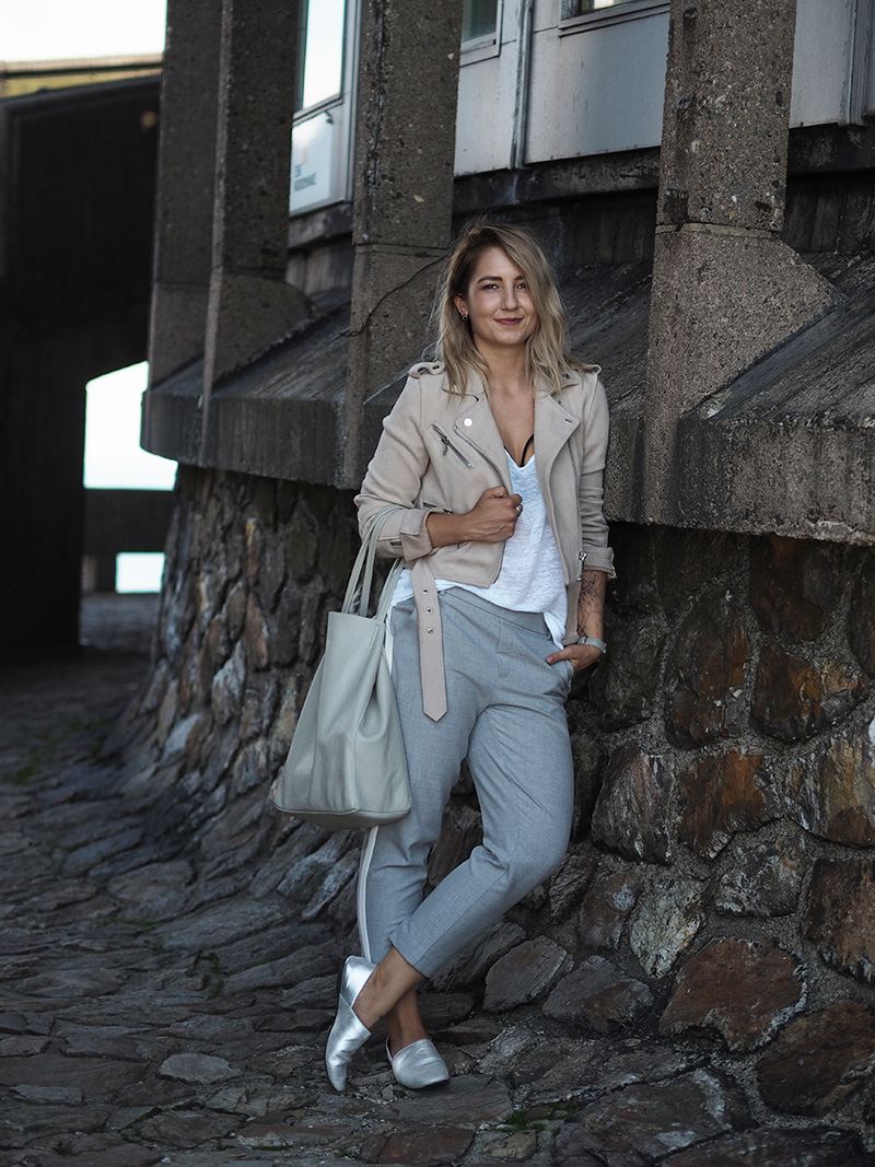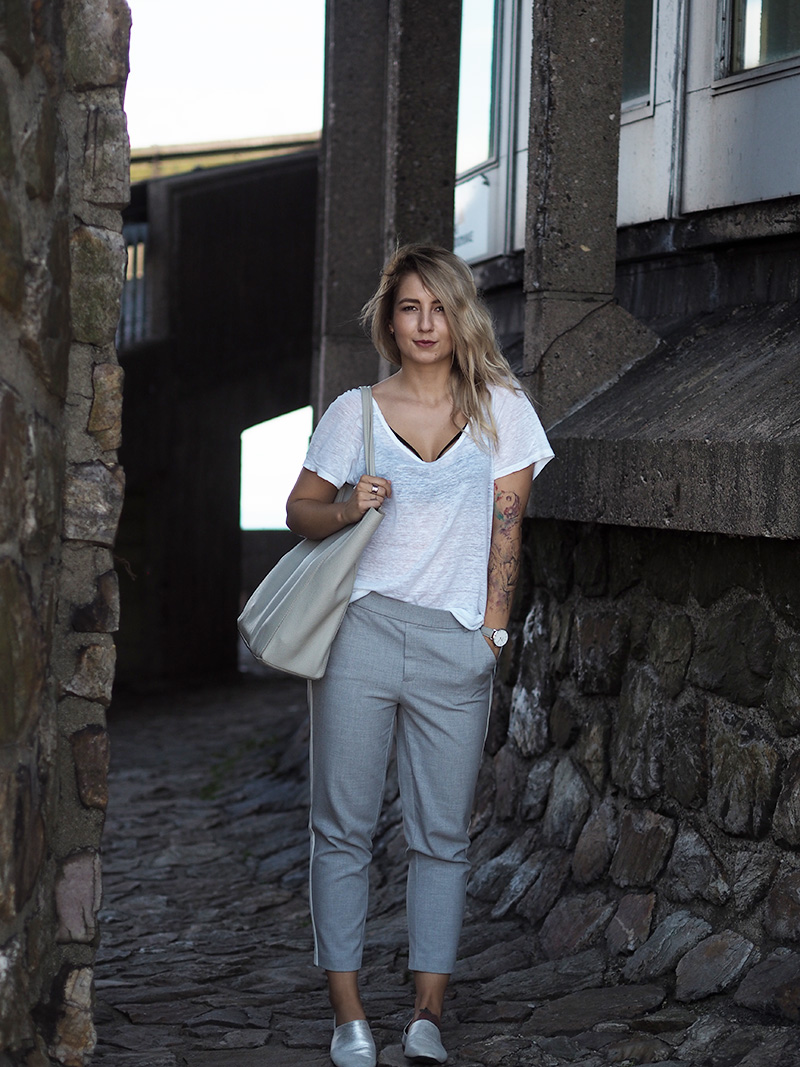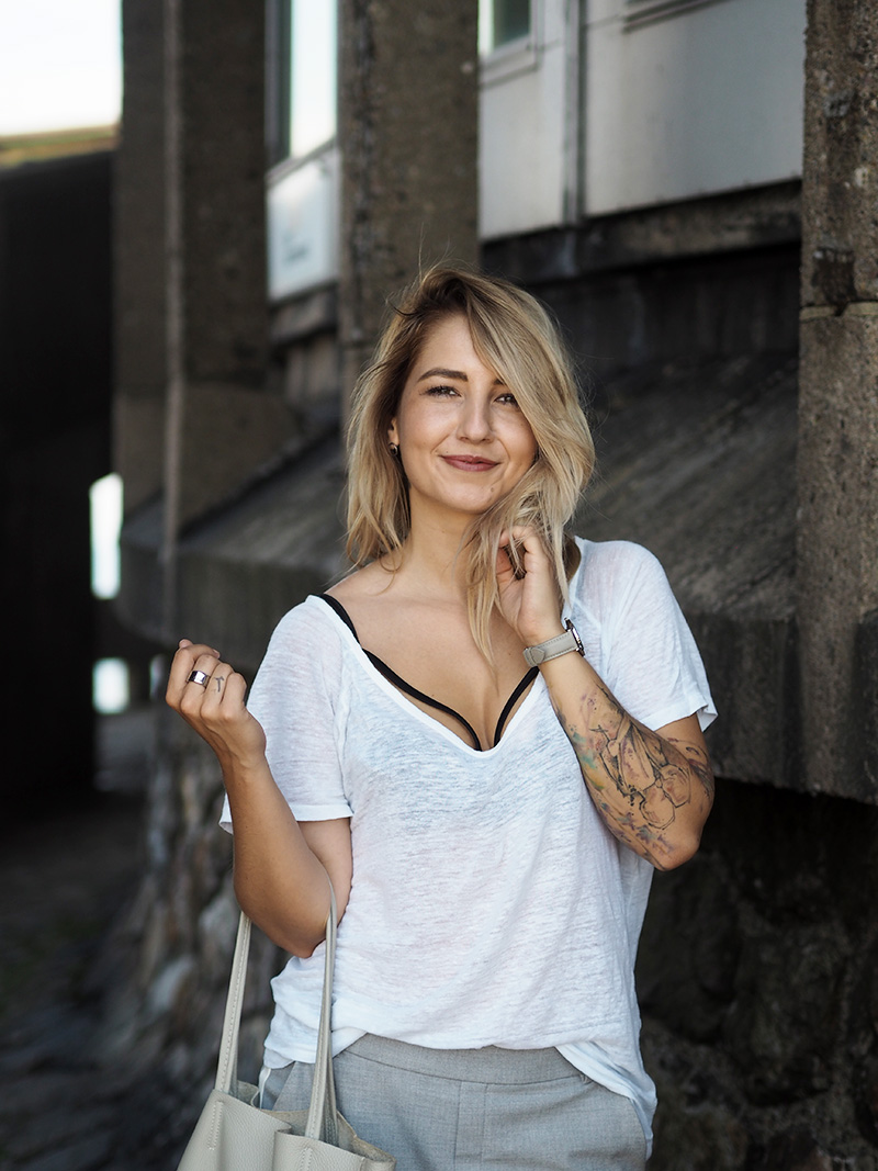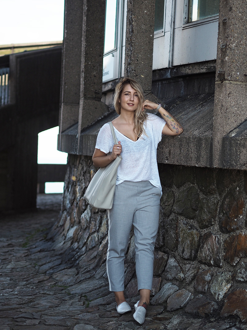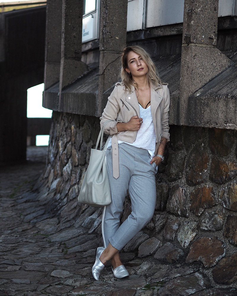 Poslední dobou se oblíkám víc podle nálady než podle příležitostí a akcí, co mě ten den čekaj. Zaprvé se to týká barev, zadruhý střihů. Nedávno jsem na sebe třeba navlíkla pytlovitý šaty a obří bundu, protože jsem prostě chtěla být tak nějak schovaná a myslím, že to i mám nafocený, takže uvidíte příště. Když jsme ale vyráželi na výlet do Liberce, měla jsem náladu na něco pohodlnýho, světlýho a zároveň jsem měla v hlavě, že by to mělo být něco, v čem budu schopná pochodovat a v čem zároveň můžu jít večer na blogerskou akci. A protože tohle jsou dva dost nekompatibilní požadavky, vznikl z toho po chvilce zoufalství tenhle outfit. Asi byste neřekli, že jsem takhle oblečená lezla na Ještěd, ale přece jen jsme šli pěšky jen kousek, tak se to dalo. Ale nový boty si už na celodenní výlet brát rozhodně nebudu, protože mě bolej ještě dnes. No a když světlounkej outfit, tak focení na pěkně temným místě, podle mě to k sobě krásně jde a každej kousek vynikne.