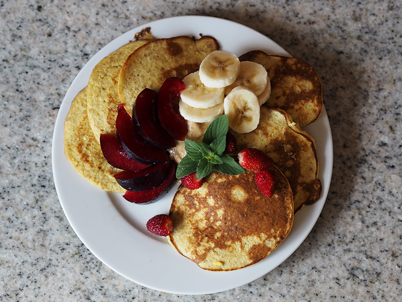 Oblíbila jsem si novou verzi banánových lívanců a dělám si ji teď každej den, protože je to výborný a hlavně to zasytí mnohem víc, než ta moje původní verze. Tahle obsahuje banán, 2 vajíčka, půlku tofu a hrst vloček.